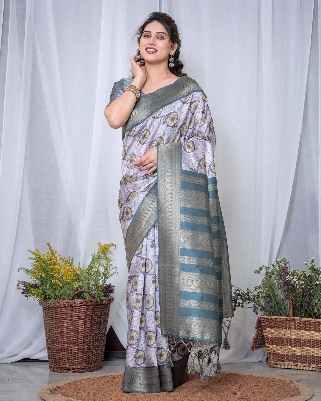 Graceful Banarasi Digitally Printed Silk Saree in Silver and Teal with Zari Work and Tassels
