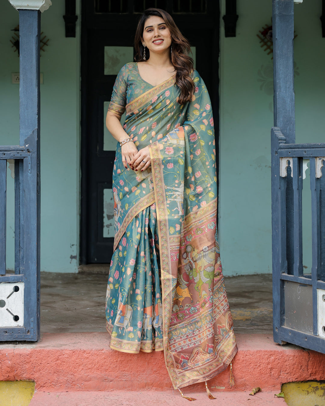 Teal Green & Brown Pure Linen Cotton Handloom Saree with Royal Cow & Tree Motif Pallu