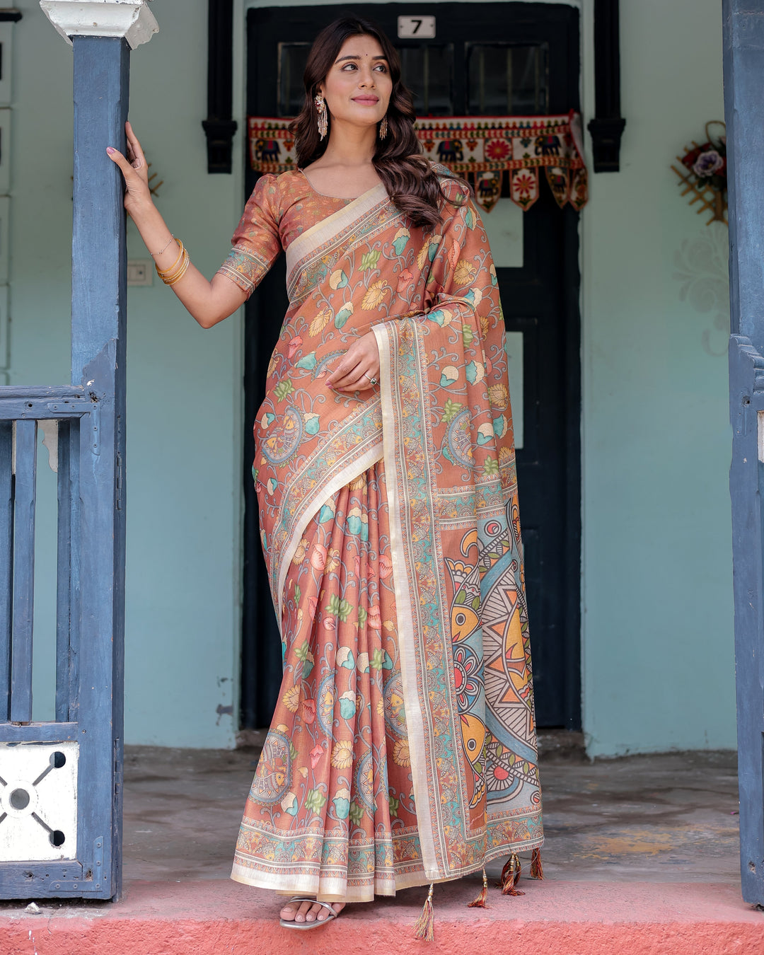 Terracotta Peach Handloom Cotton Saree with Multicolor Floral Vines & Kalamkari-Inspired Pallu