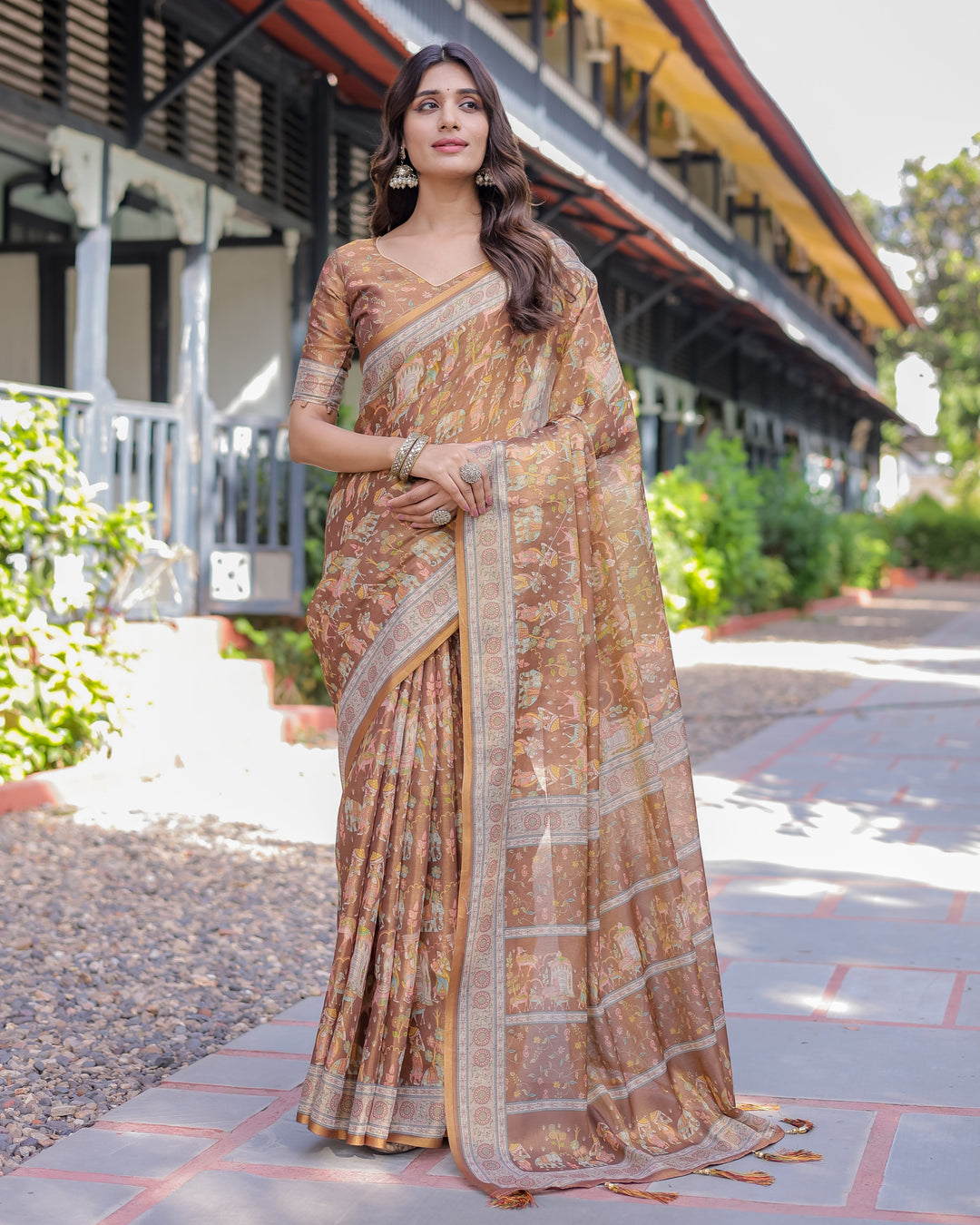 Royal Brown Procession Print Handloom Cotton Saree with Illustrated Pallu & Blouse