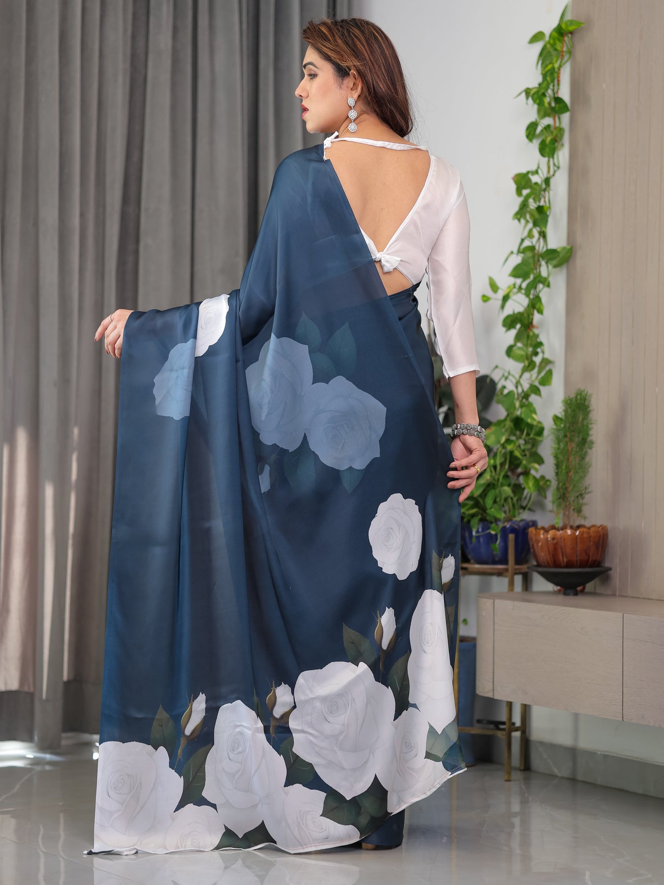 Midnight Blue Satin Georgette White Rose Printed Saree with Attached Blouse – Elegant Designer Saree for Festive & Evening Wear