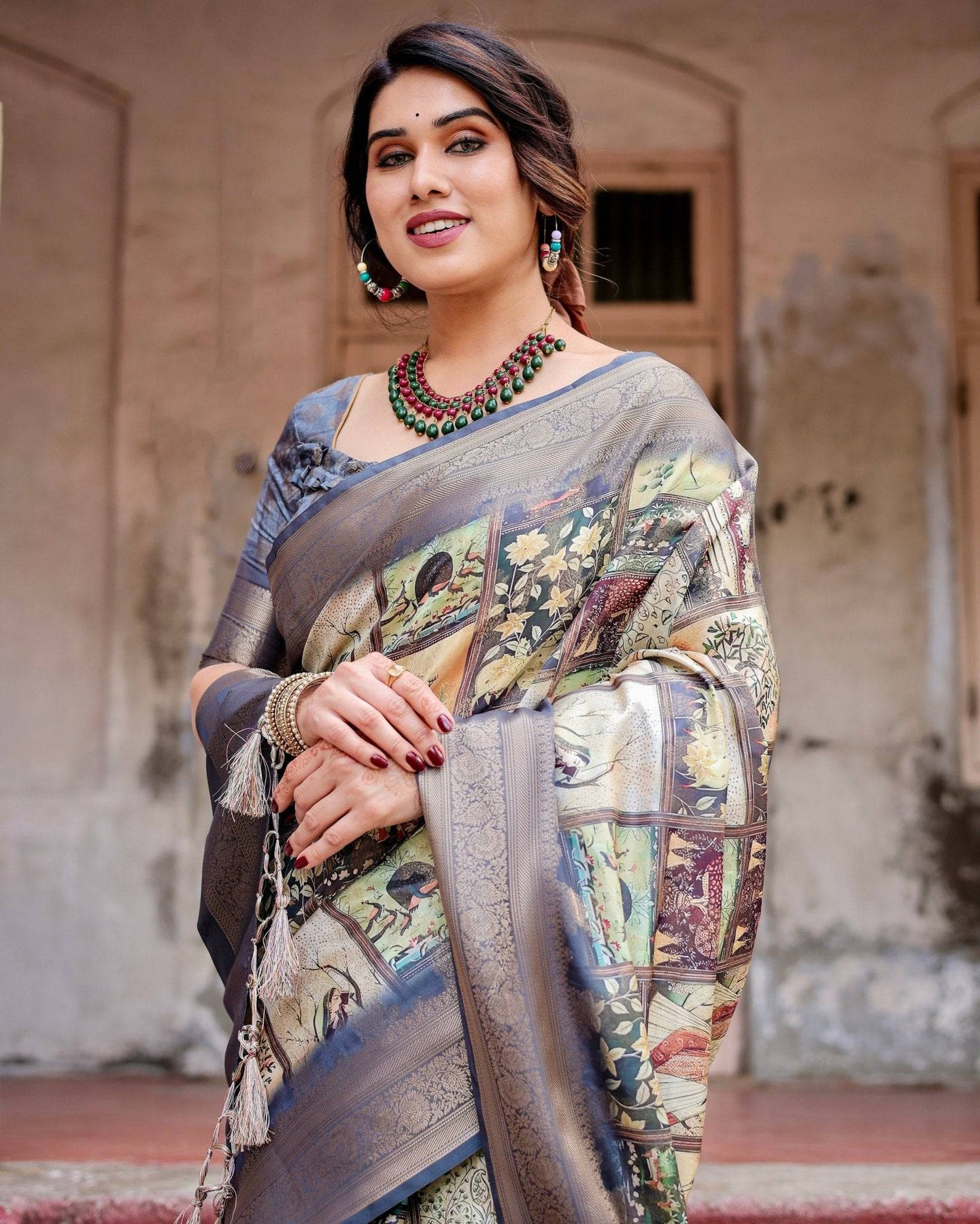 Drape yourself in elegance with this exquisite Banarasi silk saree in a soft beige shade. Featuring intricate multicolor paisley and floral motifs, this saree is a perfect blend of tradition and modernity. The beautifully woven zari pallu and tassels add a luxurious touch, making it an ideal choice for weddings and festive occasions. Pair it with statement jewelry to complete the look.