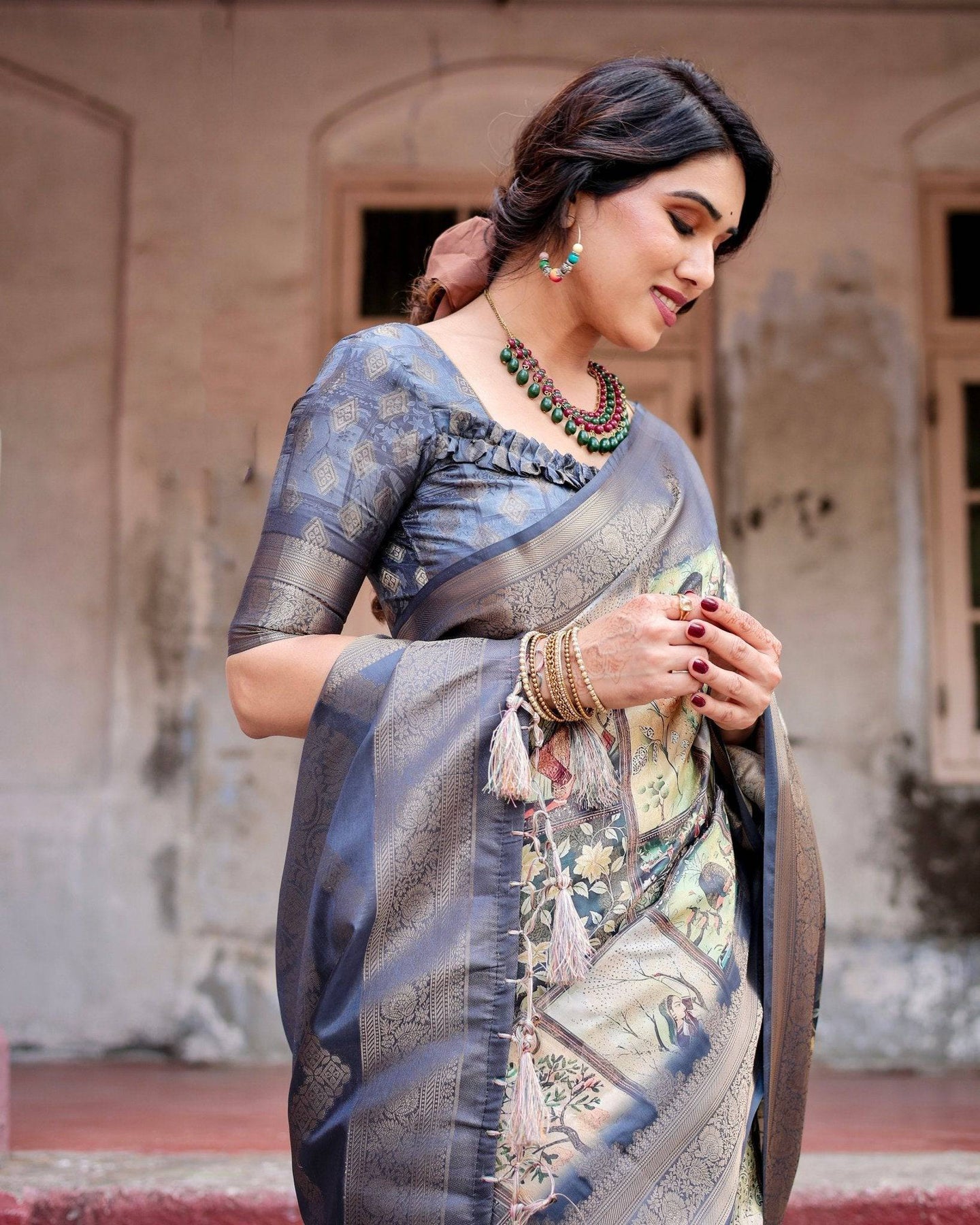- Design: Showcases vibrant digital prints combined with traditional Banarasi motifs, creating a unique and captivating aesthetic.