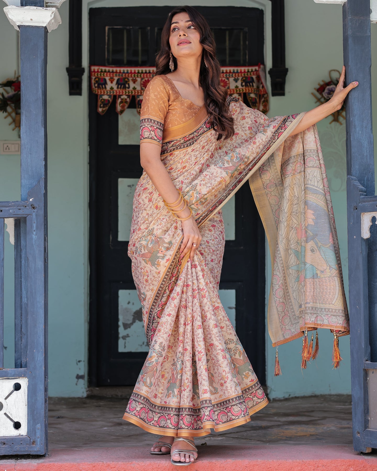 The true marvel lies in the pallu – a vivid, Madhubani-inspired depiction of a sacred cow, surrounded by lotus blooms, sun motifs, and intricate temple leaf patterns. With a rich border of maroon floral trellises and golden highlights, the saree is finished with festive saffron tassels that elevate its charm.