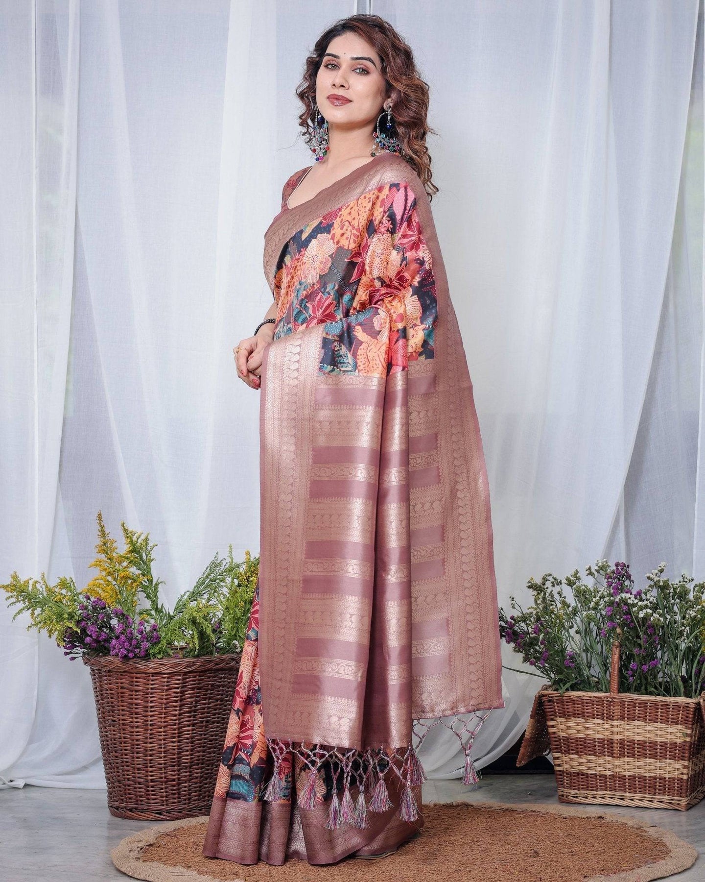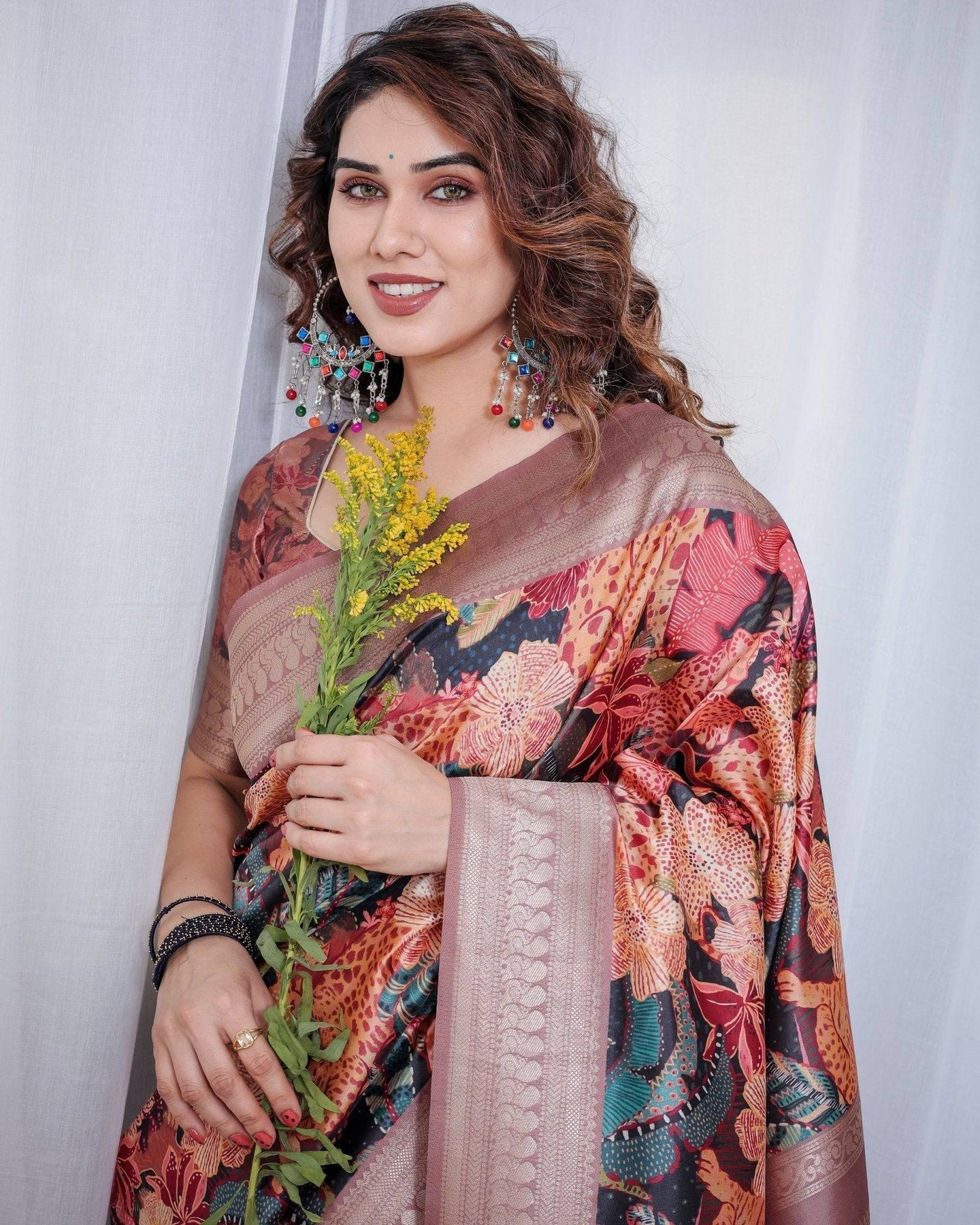 Elevate your ethnic collection with this pure Banarasi digitally printed silk saree, a masterpiece that seamlessly blends traditional artistry with modern sophistication.