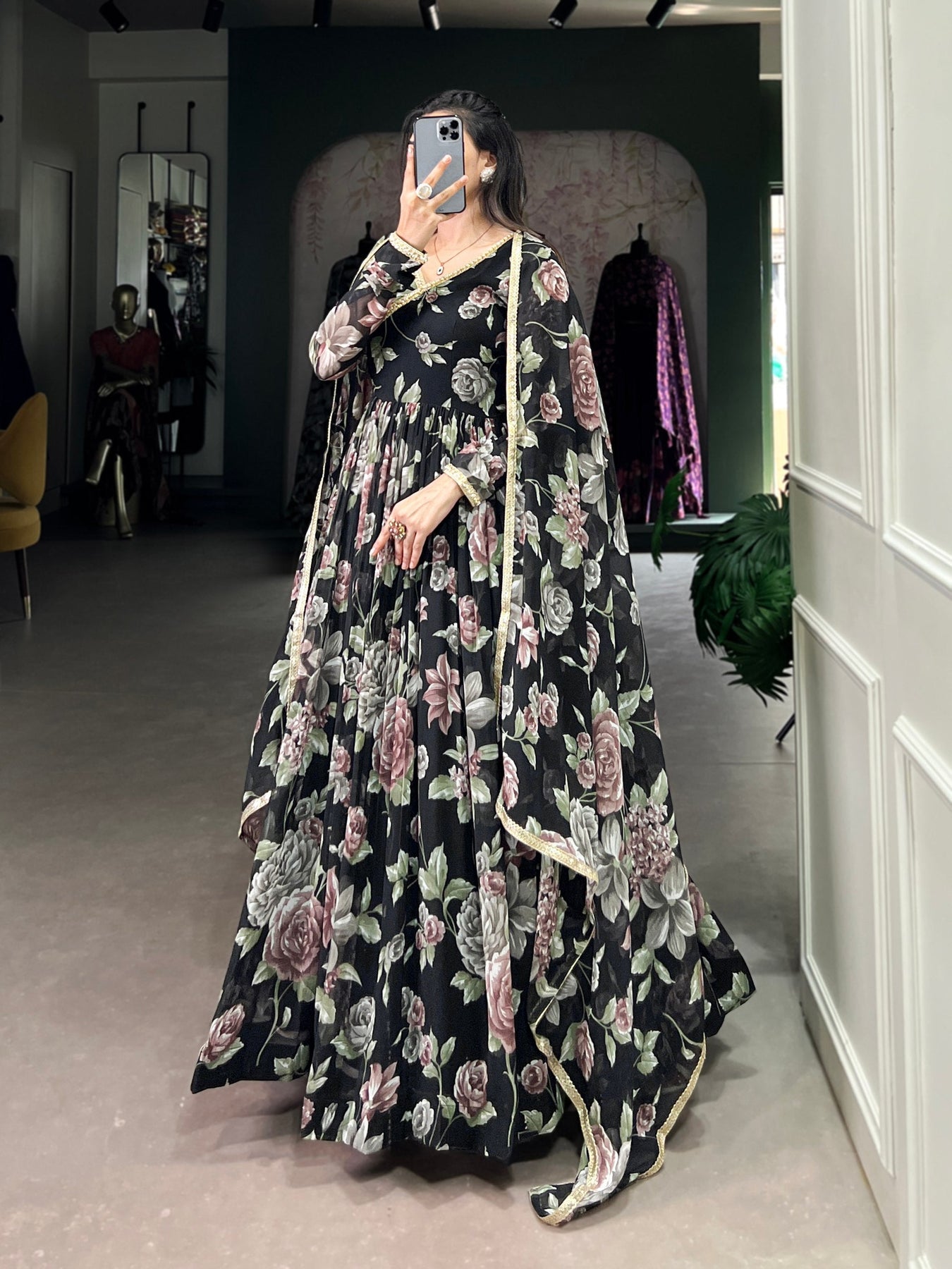 Black Marble Floral Print Gown with Lace Detailing & Dupatta