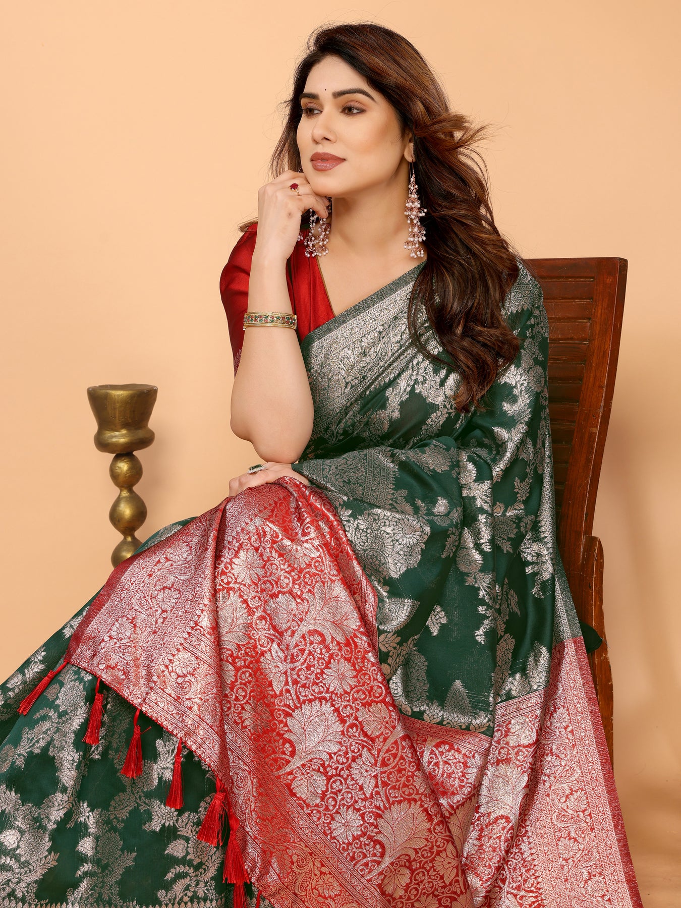 Bottle Green Banarasi Silk Saree with Silver Zari Weaving & Red Pallu – Elegant Wedding & Festive Collection