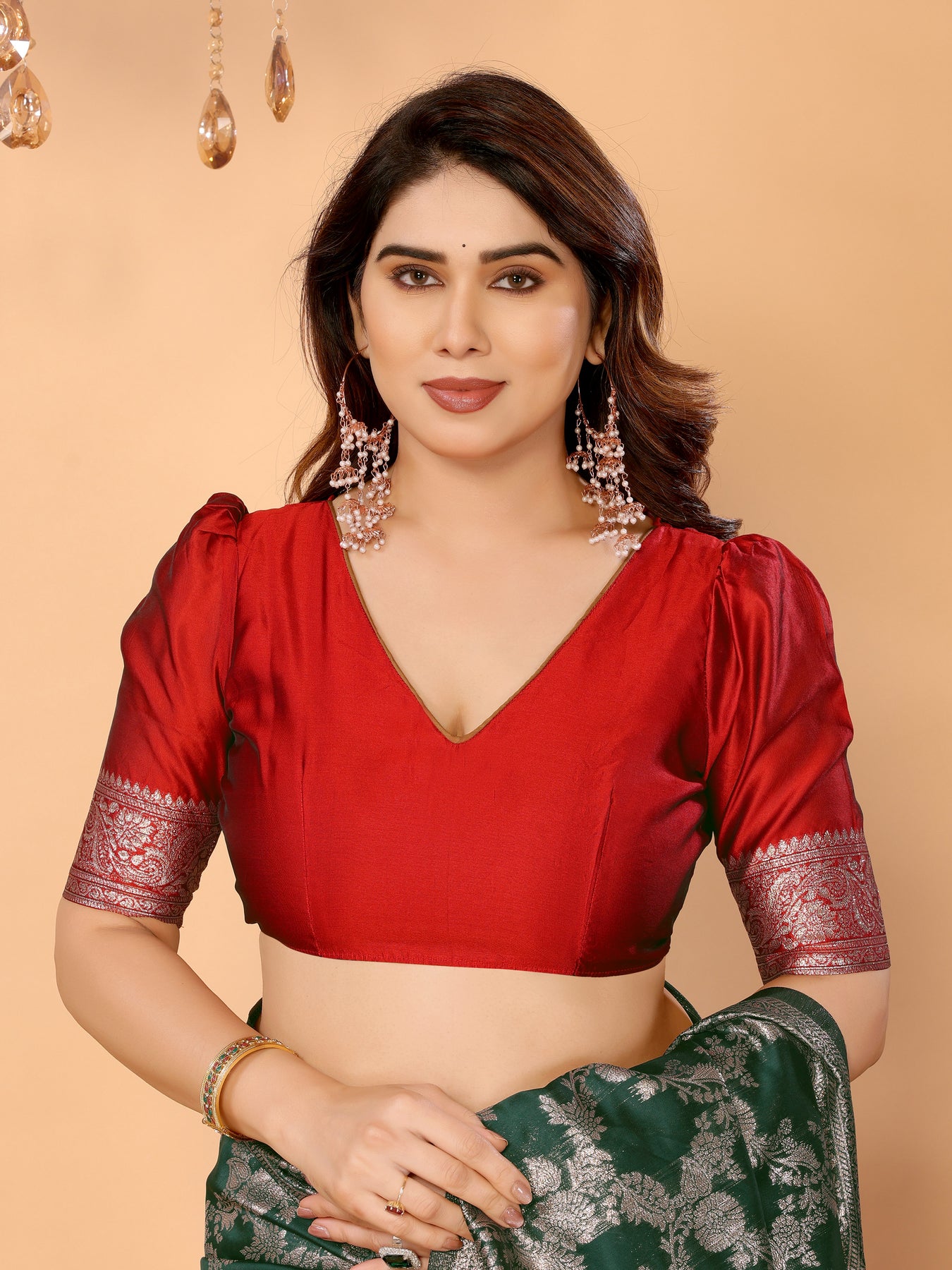 - Blouse: Unstitched Deep Red Blouse with Zari Sleeve Detailing 0.8 MTR