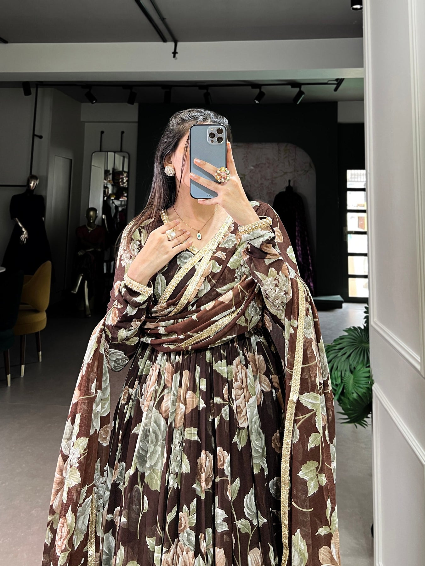 💃✨ Add a touch of royal charm to your wardrobe with this Brown Floral Printed Gown Set, perfect for a graceful and sophisticated look! ✨💃
