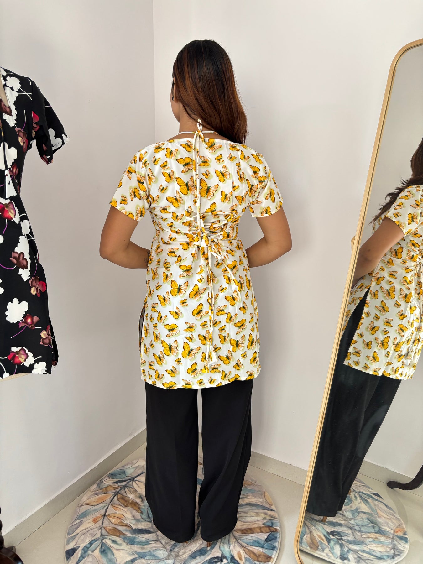 Butterfly Print Cambric Cotton Kurti with Corset Back
