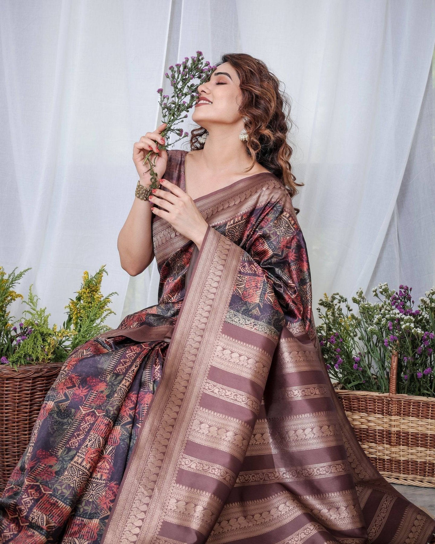 Chocolate Brown Banarasi Silk Saree with Tribal Digital Print, Zari Border & Tassel Pallu
