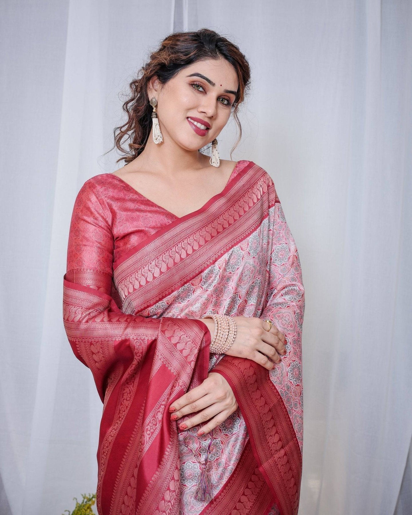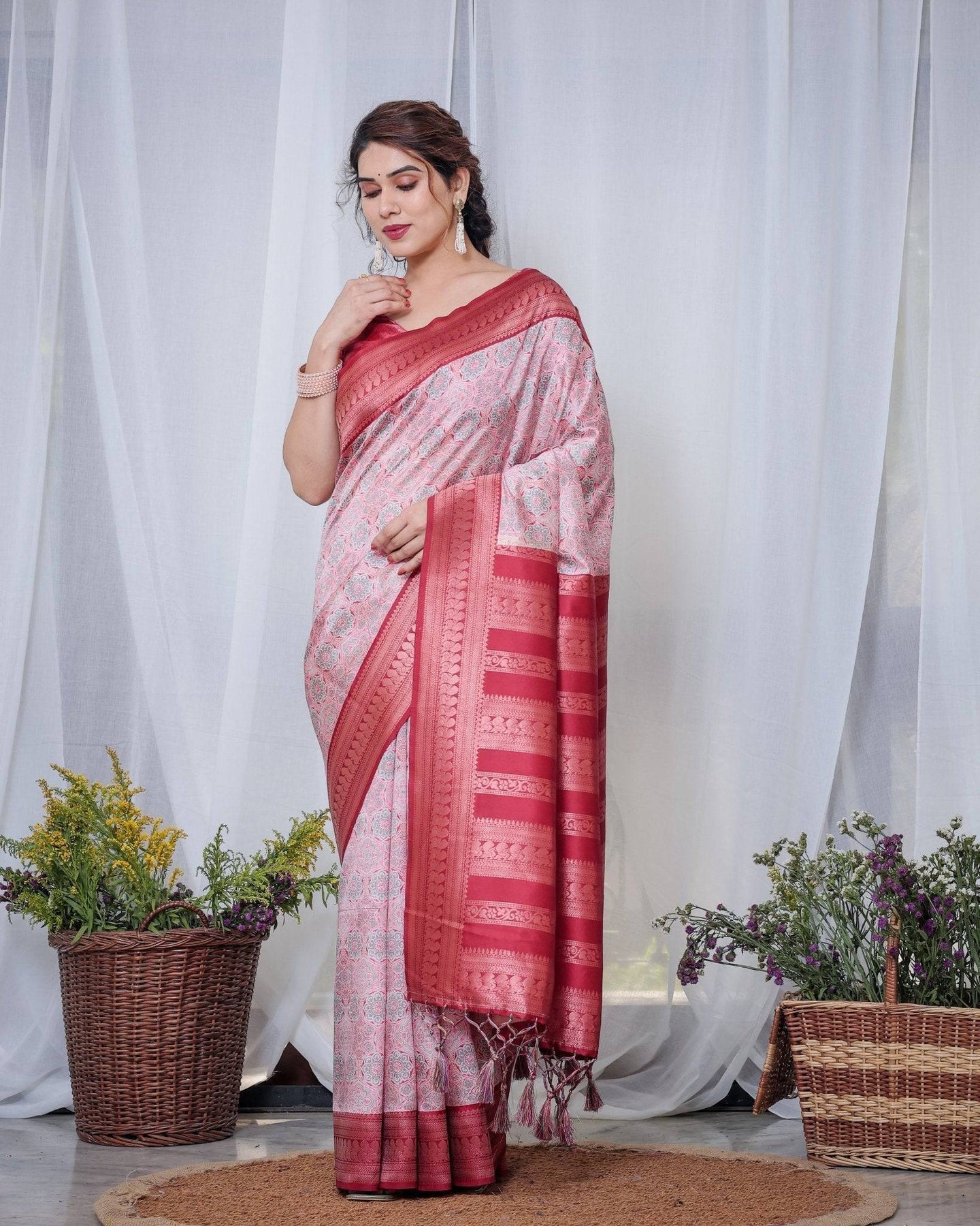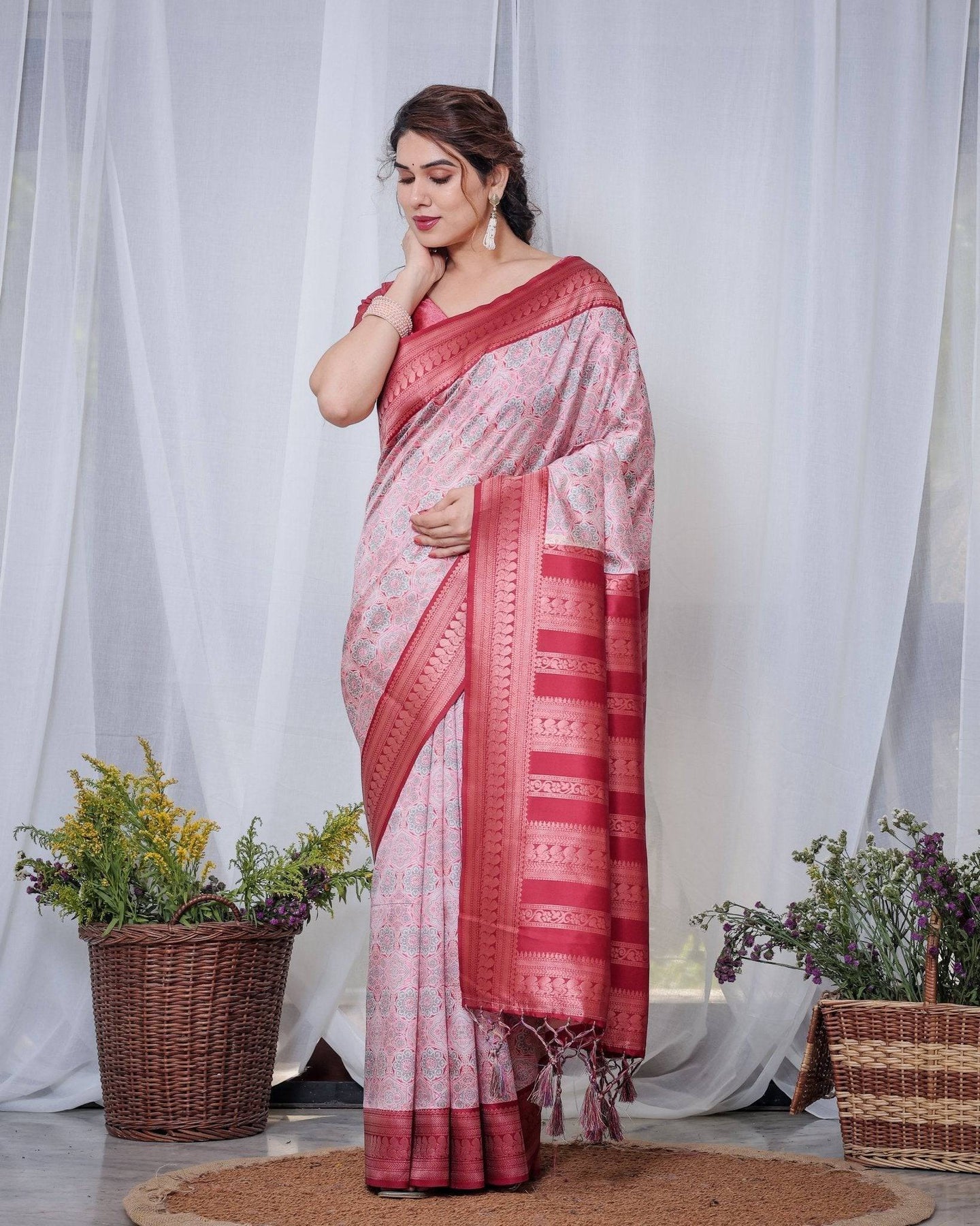 Embrace timeless elegance with this stunning Banarasi silk saree in a charming pink and white combination. The saree features intricate digital prints paired with a rich zari weave border that adds a touch of grandeur. Its lightweight silk fabric ensures comfort while exuding sophistication, making it perfect for weddings, festive occasions, and celebrations. The saree is beautifully finished with delicate tassels, adding a graceful detail to its design. Pair this exquisite piece with statement jewelry to create a captivating ethnic look..