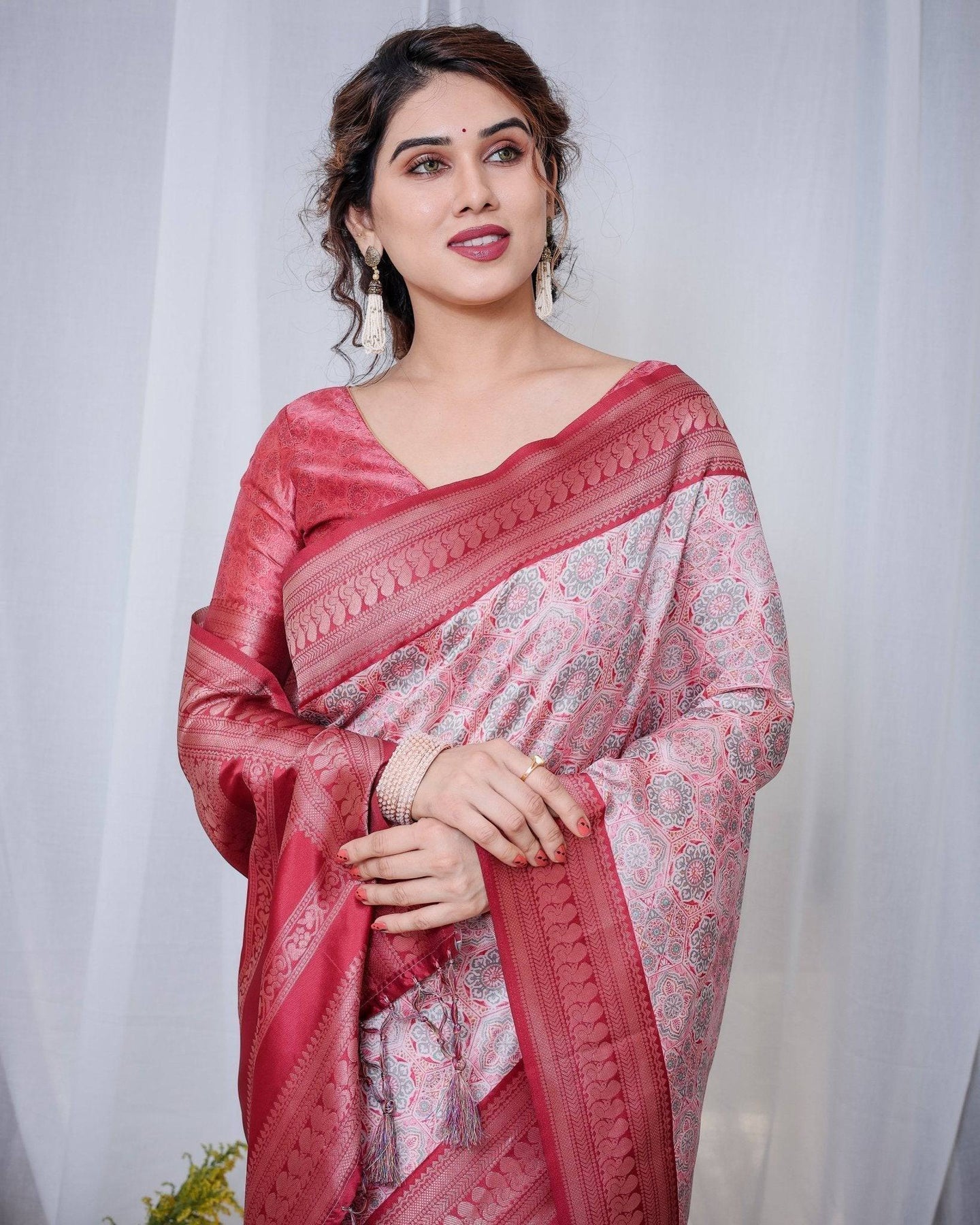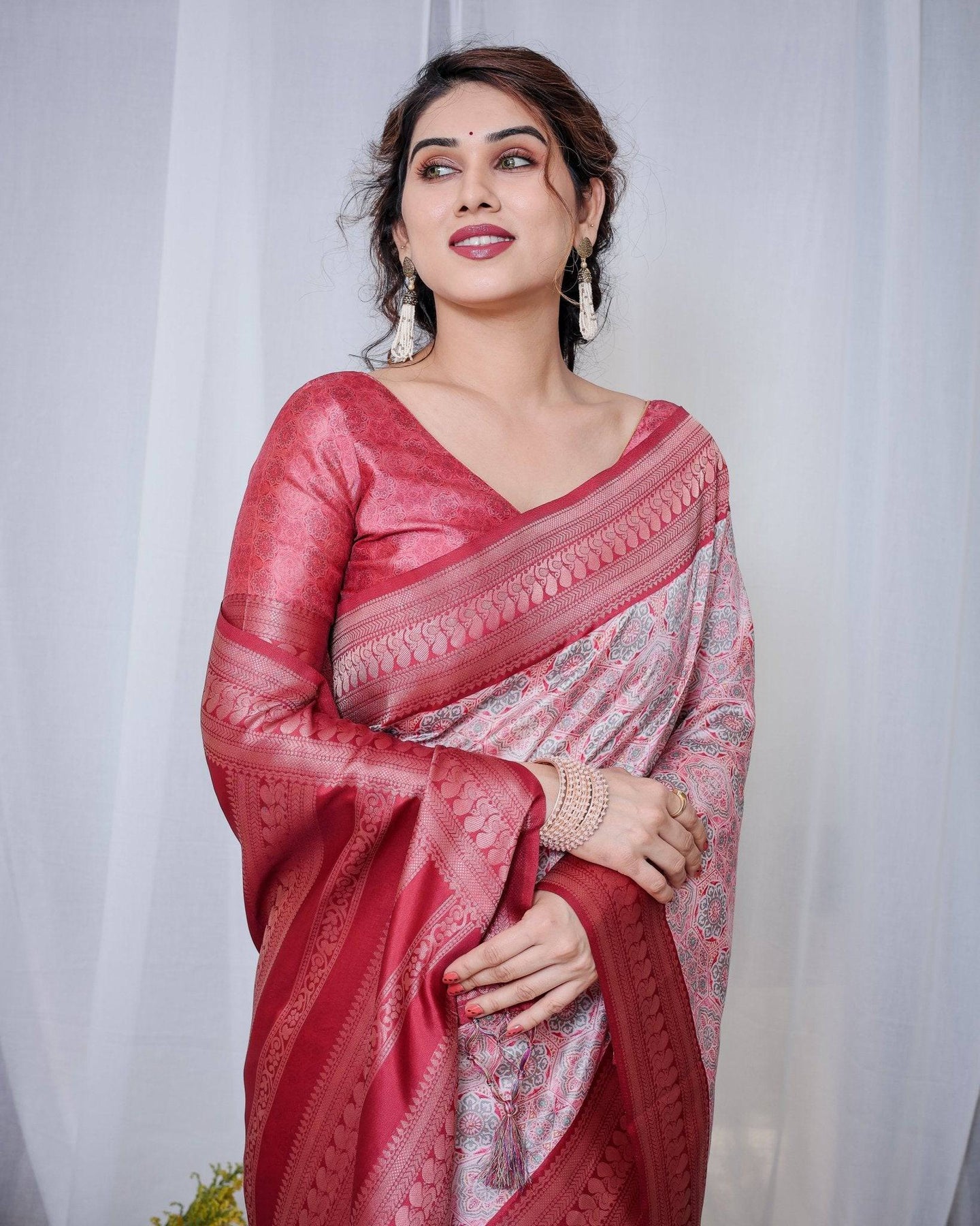 Embrace timeless elegance with this stunning Banarasi silk saree in a charming pink and white combination. The saree features intricate digital prints paired with a rich zari weave border that adds a touch of grandeur. Its lightweight silk fabric ensures comfort while exuding sophistication, making it perfect for weddings, festive occasions, and celebrations. The saree is beautifully finished with delicate tassels, adding a graceful detail to its design. Pair this exquisite piece with statement jewelry to create a captivating ethnic look..