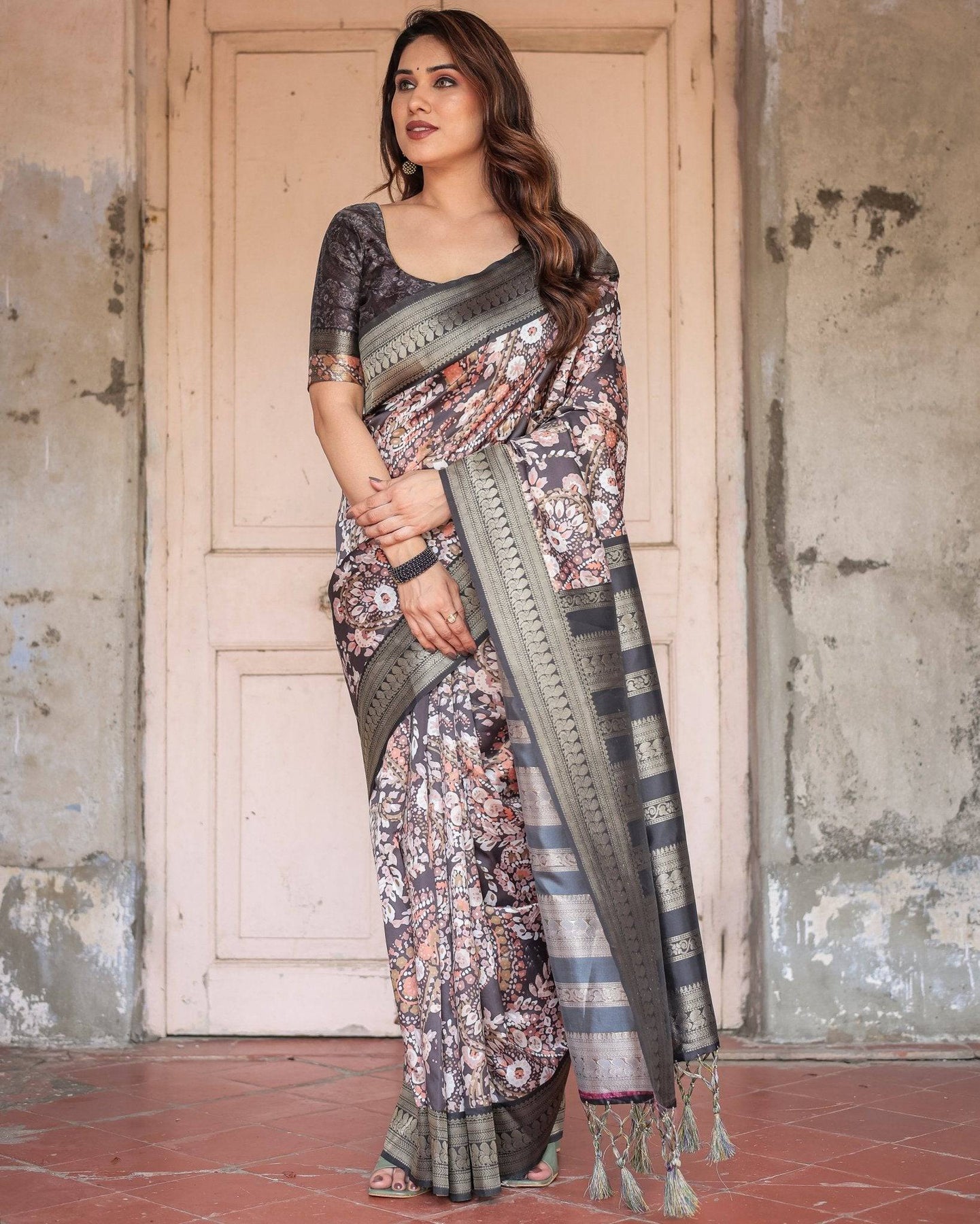 Exude timeless elegance with this black Banarasi silk saree, adorned with delicate peach floral prints and a beautifully crafted zari border. The intricate border detailing and tassels add a touch of sophistication, making this saree perfect for weddings, festive occasions, and formal gatherings.