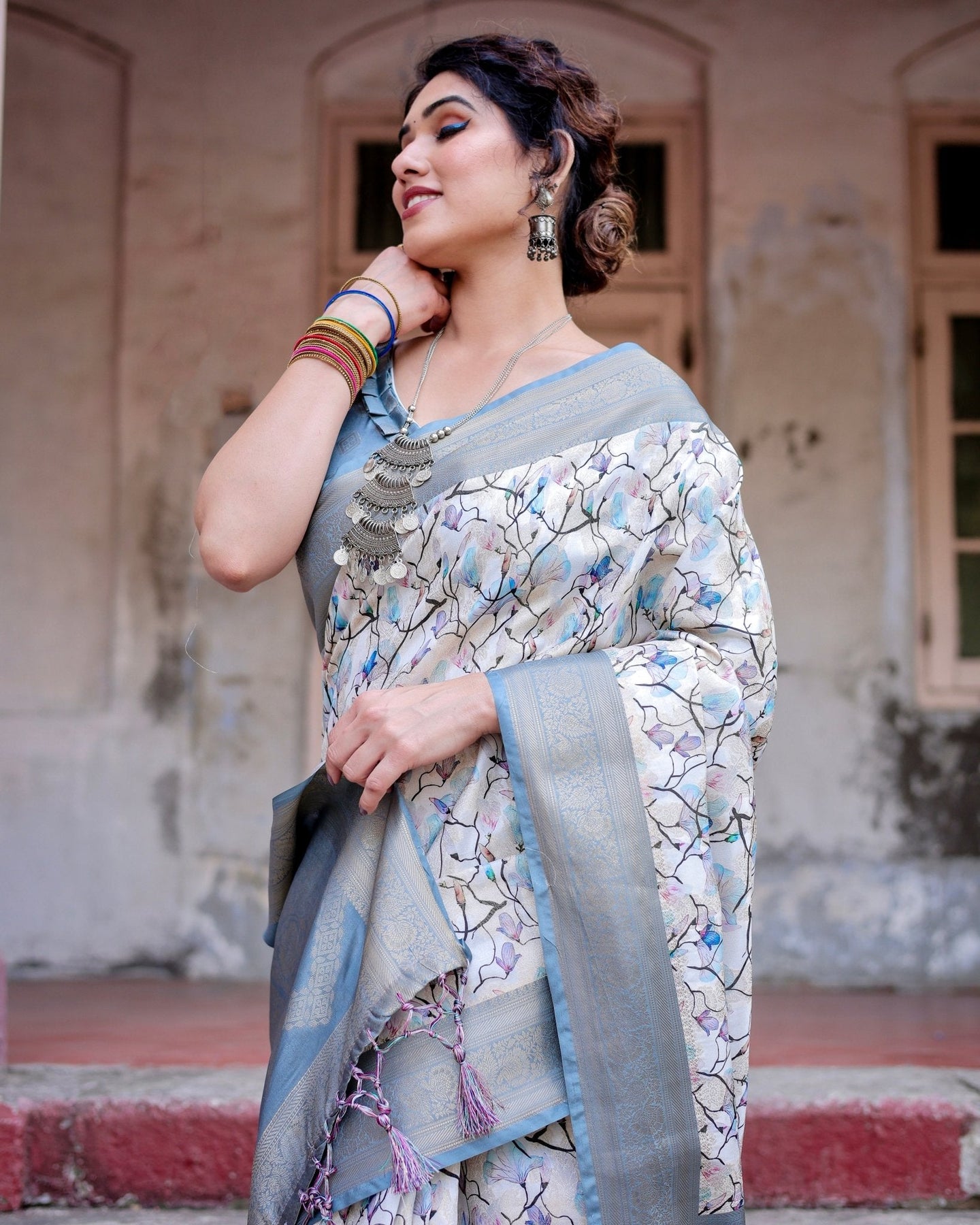Indulge in the timeless elegance of this Banarasi silk saree, showcasing a soothing combination of sky blue and ivory adorned with a delicate floral pattern across the body. The saree's pallu features intricate zari weaving in elegant blue, adding a touch of regal charm. The tasseled hem enhances its luxurious appeal, making it a perfect choice for festive celebrations and special occasions. Draped in sophistication, this saree epitomizes traditional artistry blended with contemporary grace.