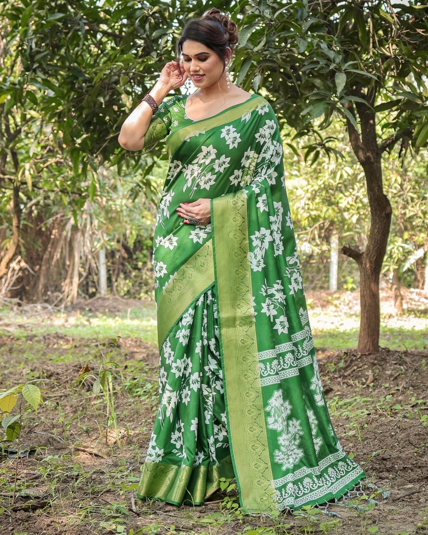 Enchanting Green Tussar Silk Saree with White Floral Prints and Zari Border