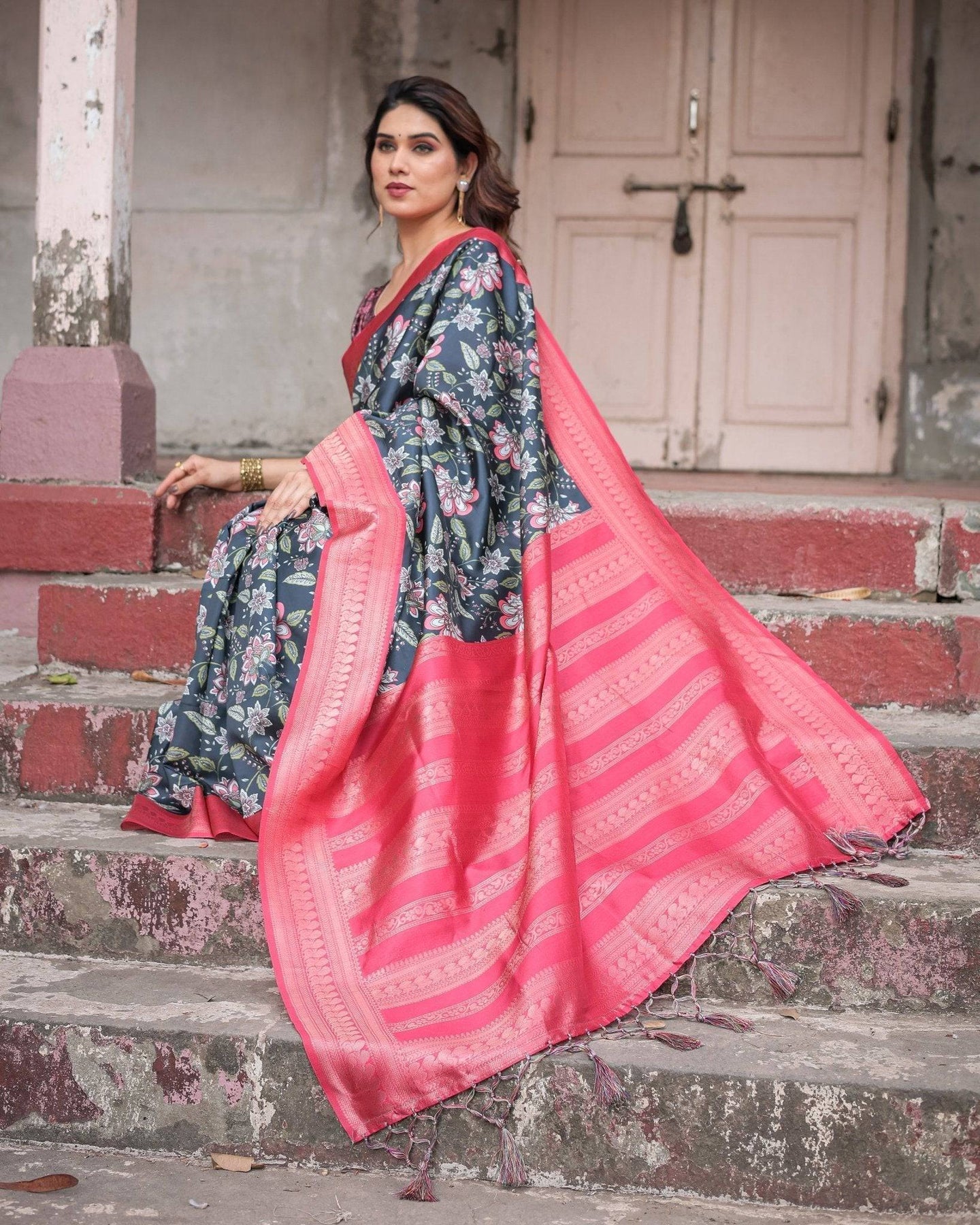 Floral Navy Banarasi Silk Saree with Bright Pink Zari Border and Tassels