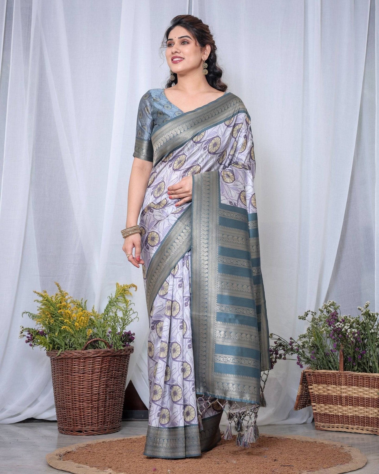 Graceful Banarasi Digitally Printed Silk Saree in Silver and Teal with Zari Work and Tassels