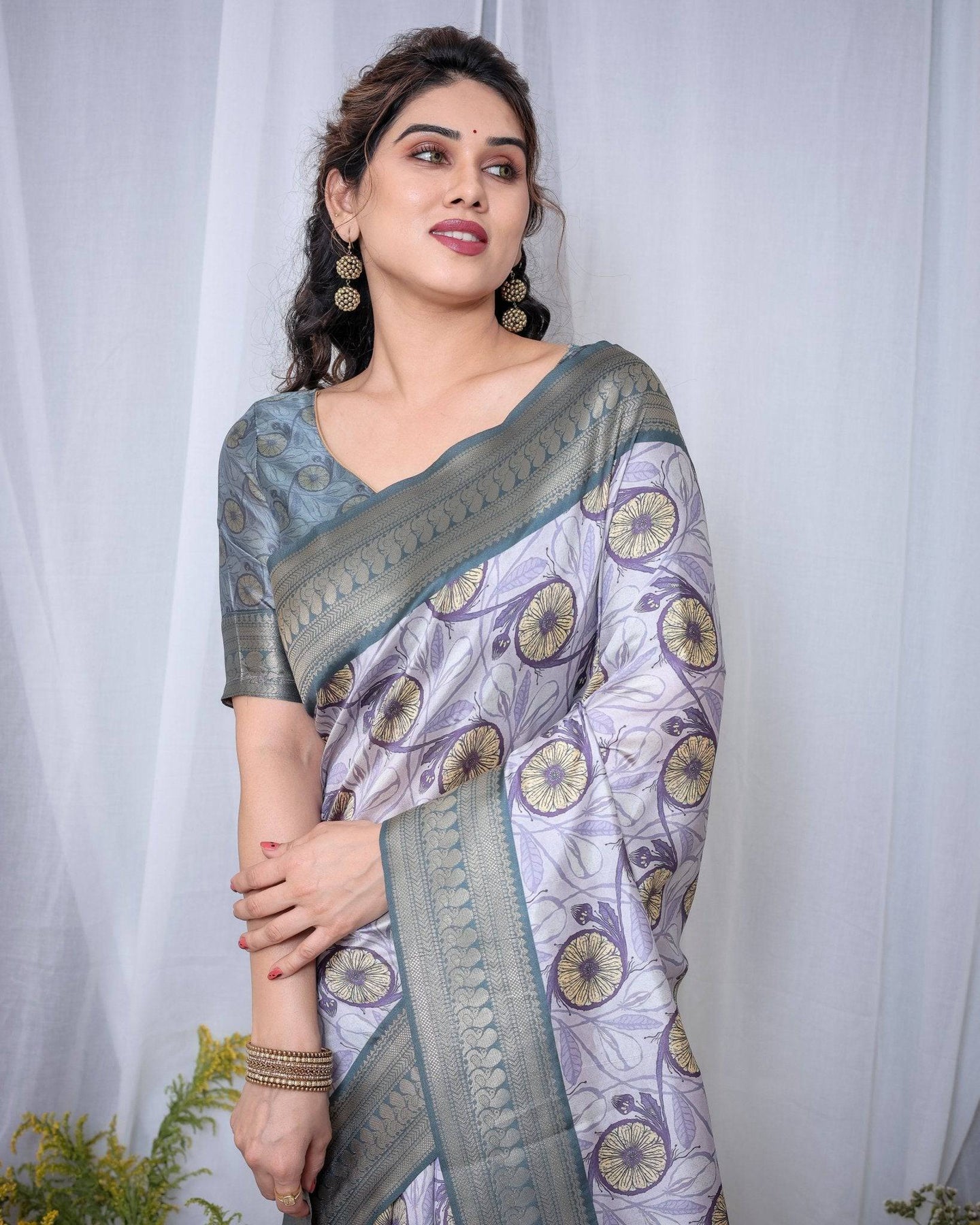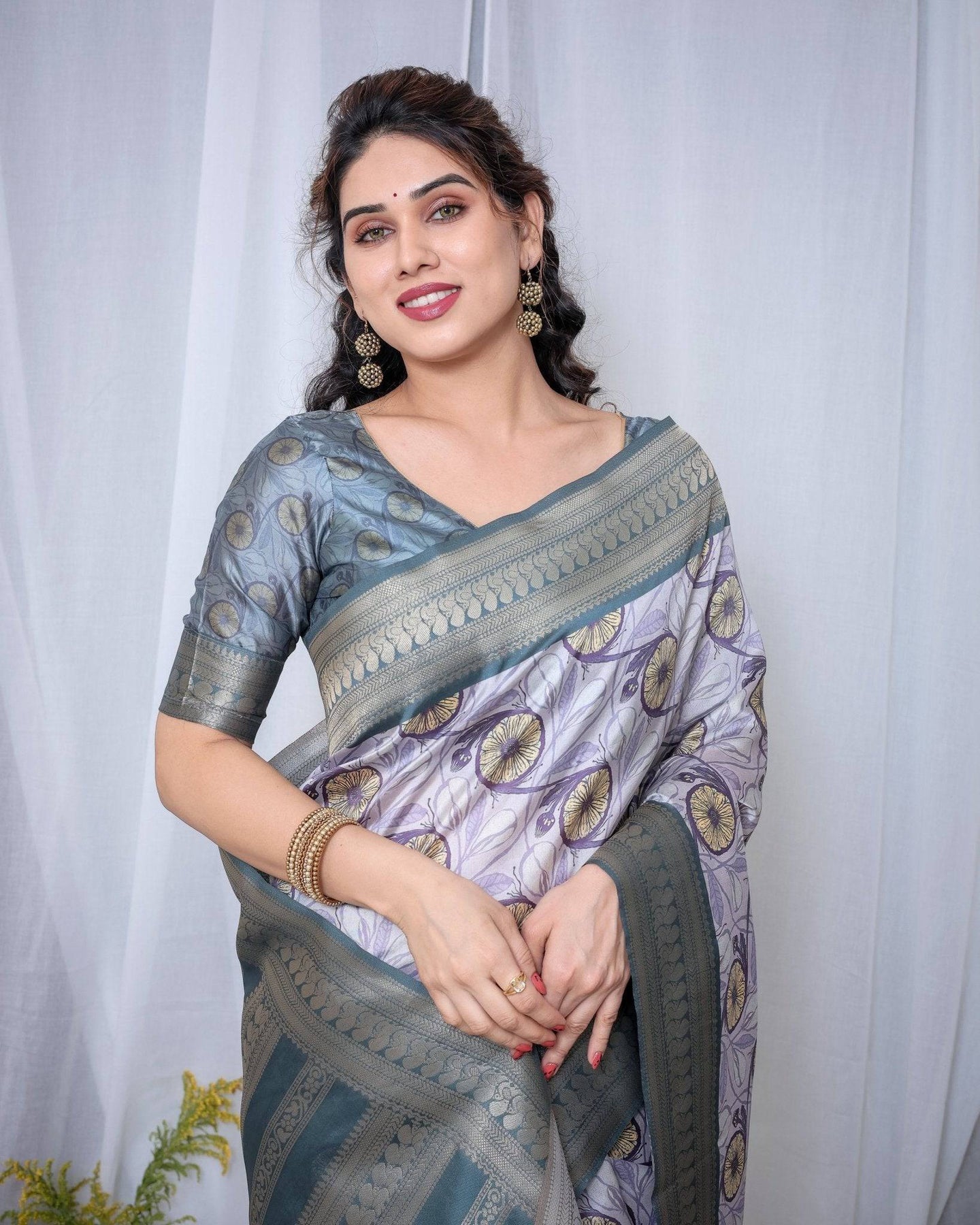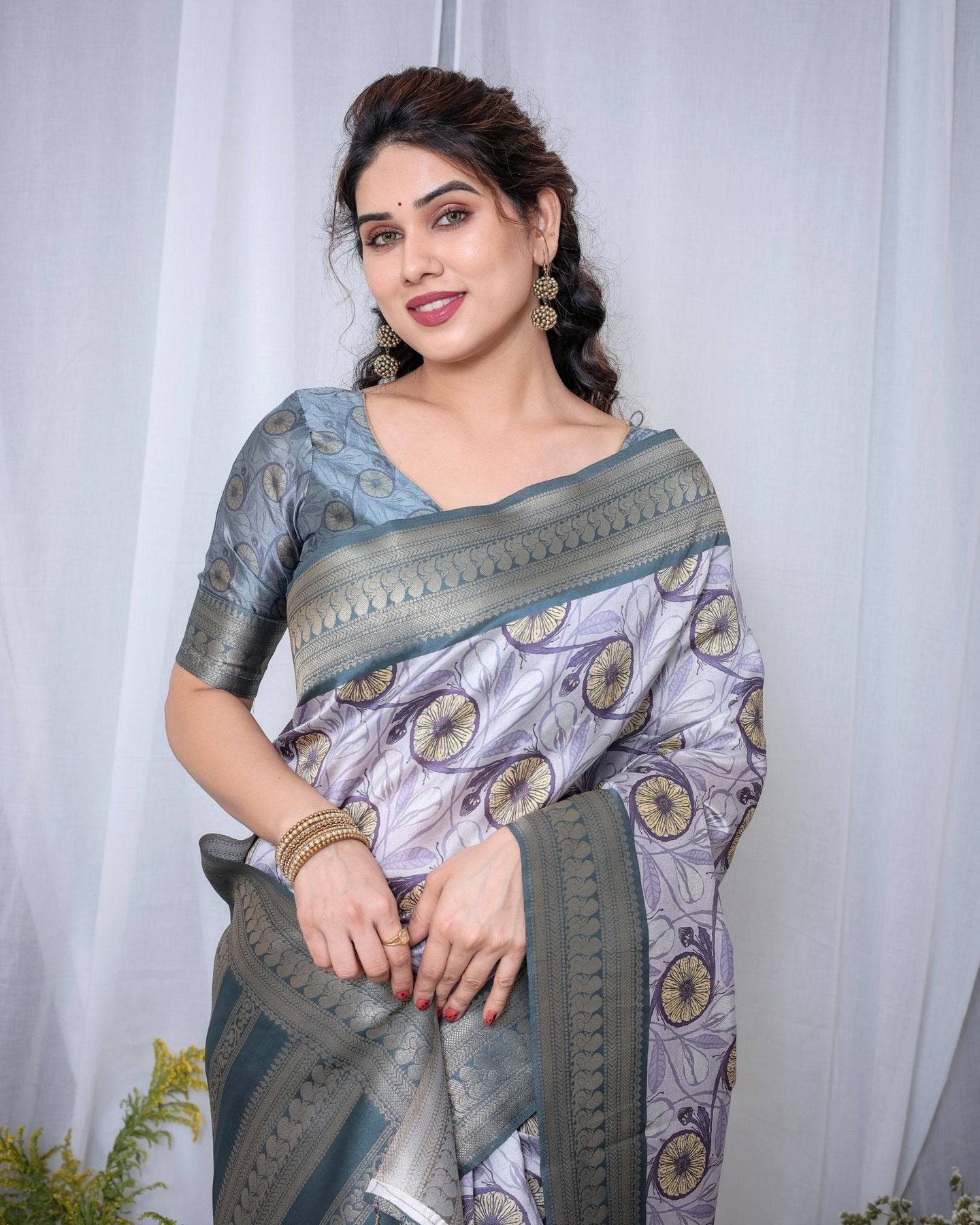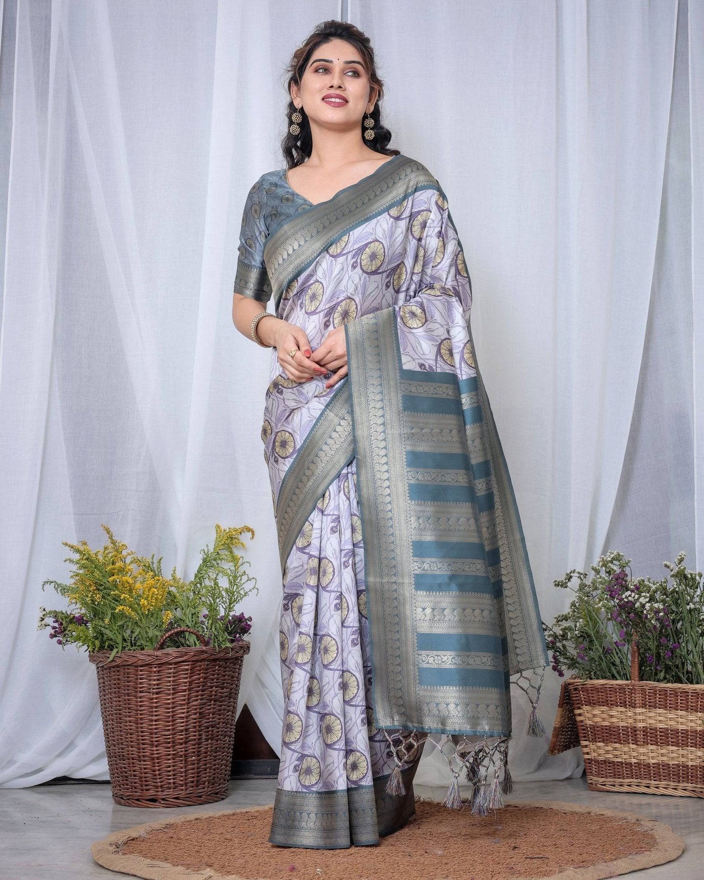 Graceful Banarasi Digitally Printed Silk Saree in Silver and Teal with Zari Work and Tassels