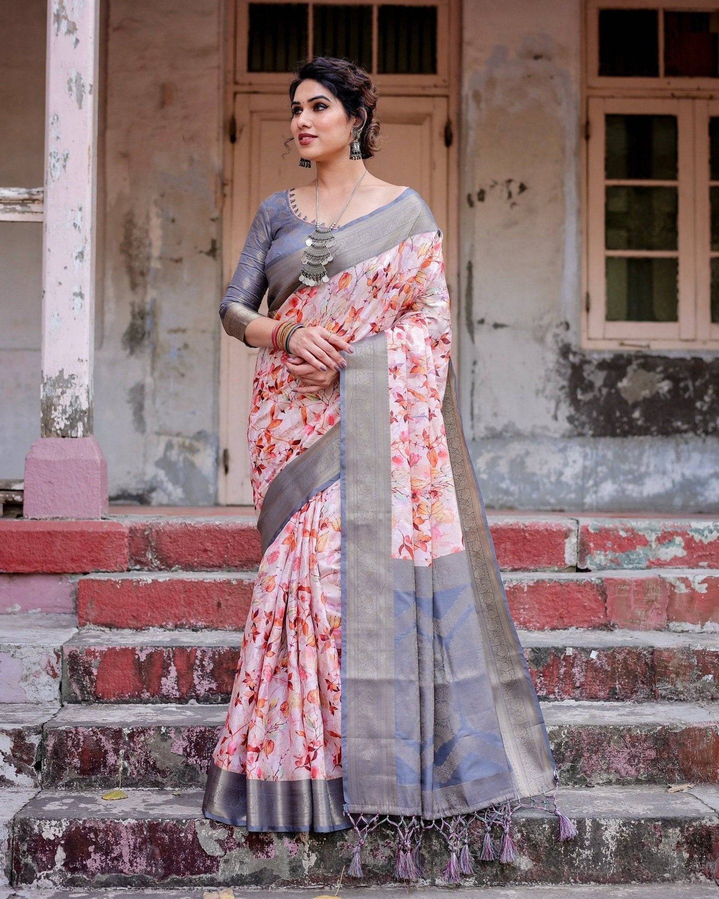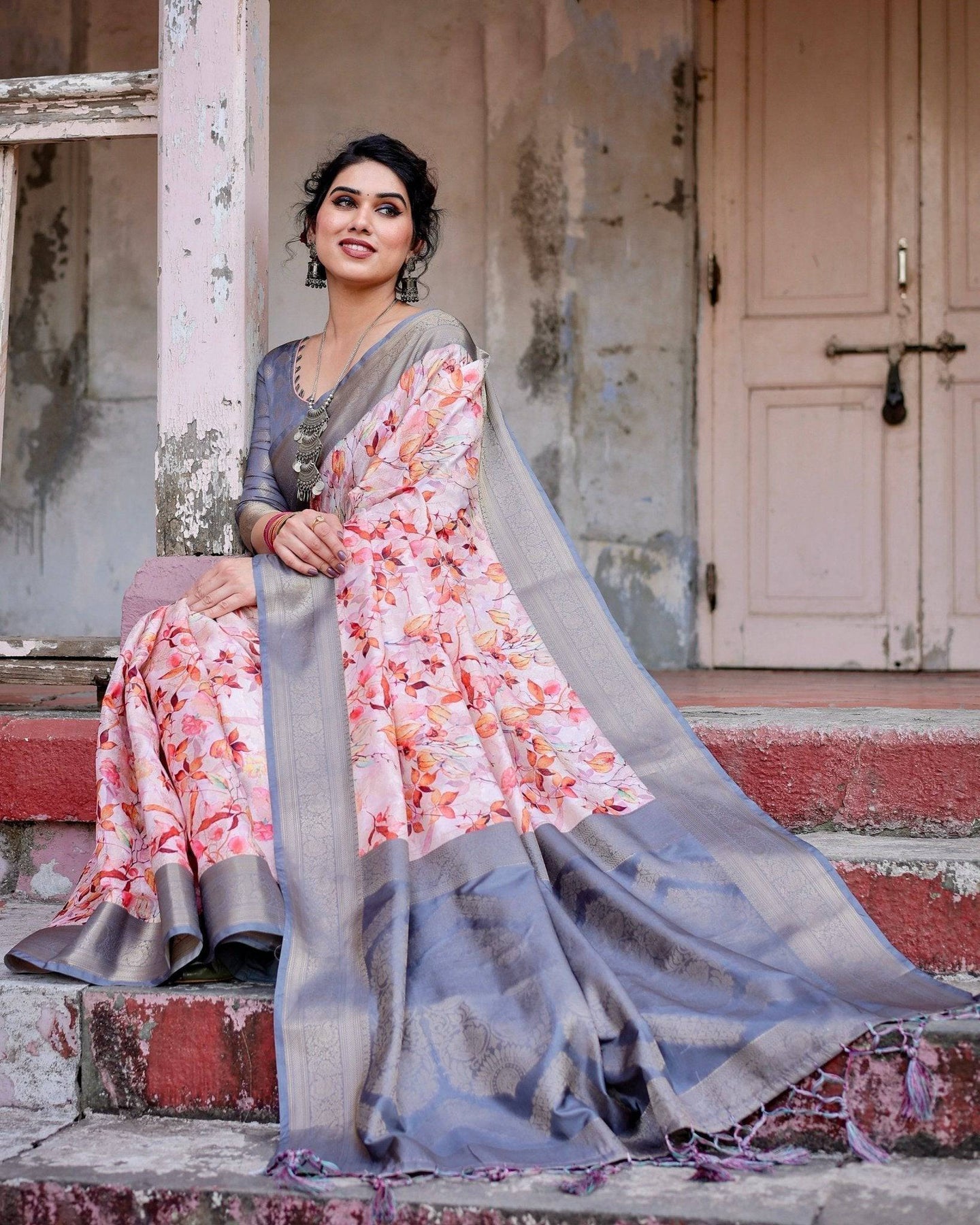 Experience timeless sophistication with this exquisite grey Banarasi silk saree, adorned with vibrant floral digital prints that add a touch of modern charm. The saree features intricate zari weaving along the borders and pallu, adding a regal finish. Complemented by delicately crafted tassels, this saree is a perfect blend of tradition and contemporary style, ideal for weddings, festivals, and celebrations. Draped in elegance, it promises to make you the center of attention wherever you go.