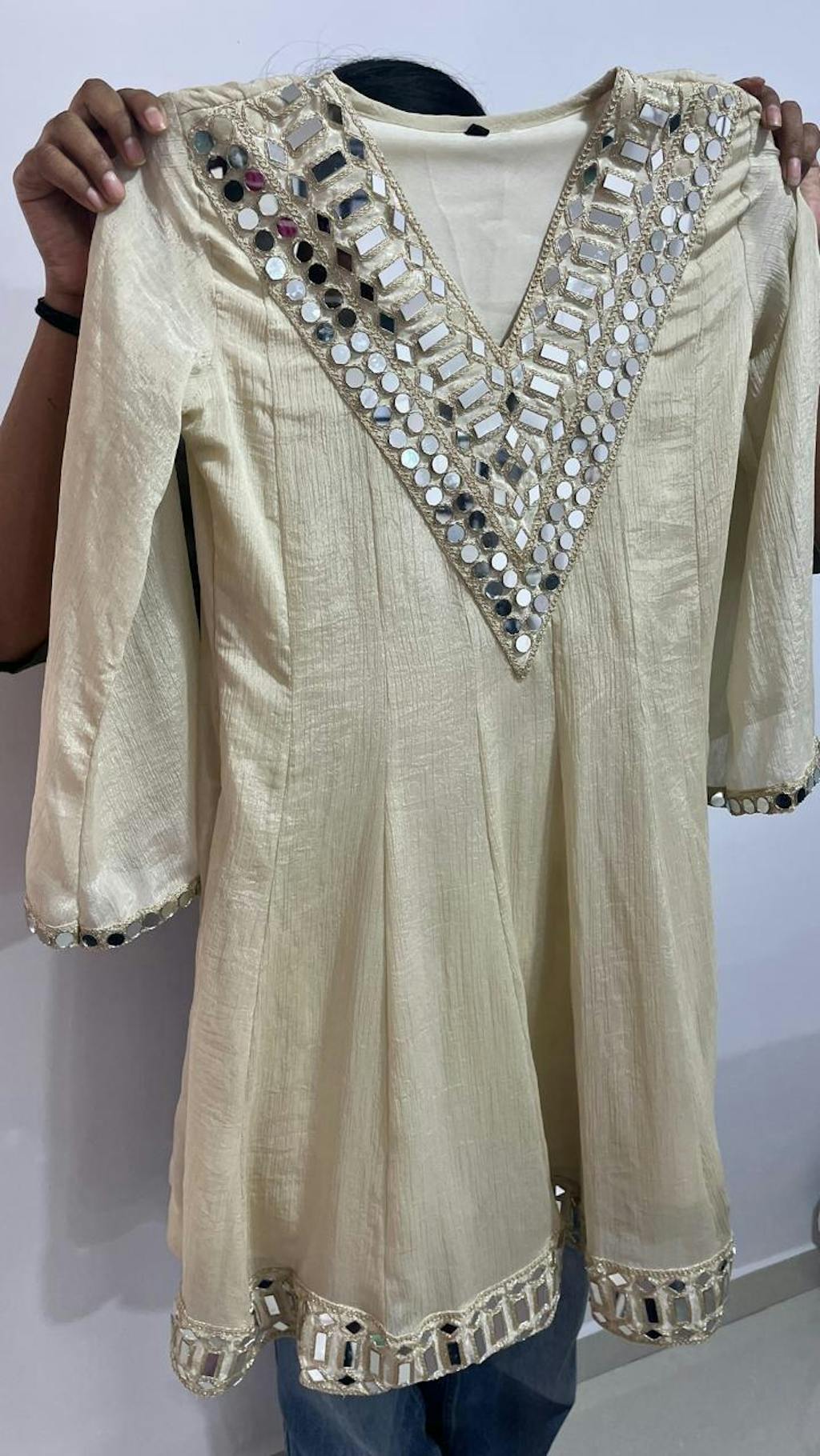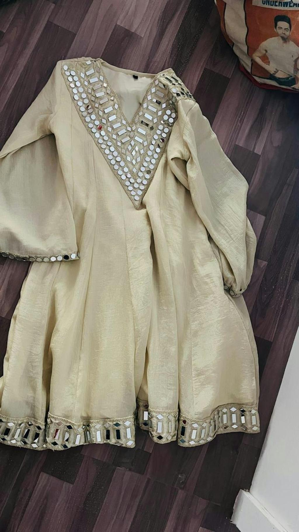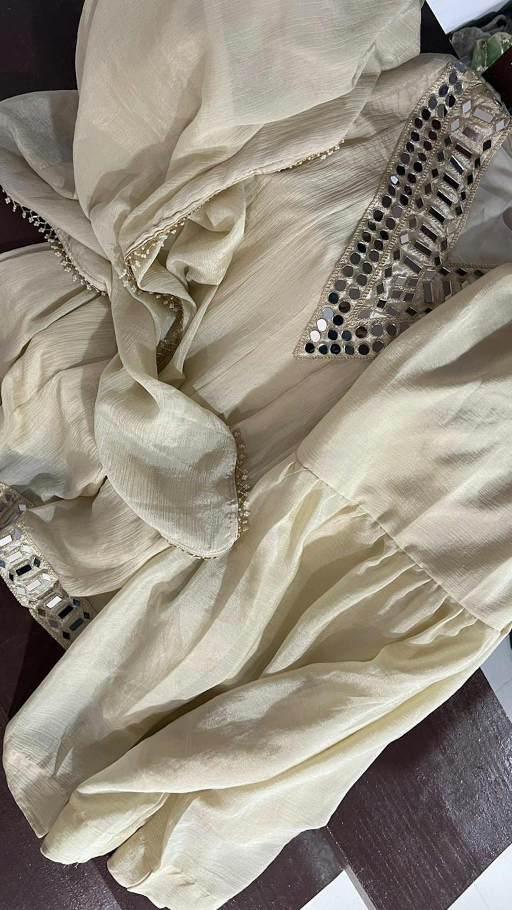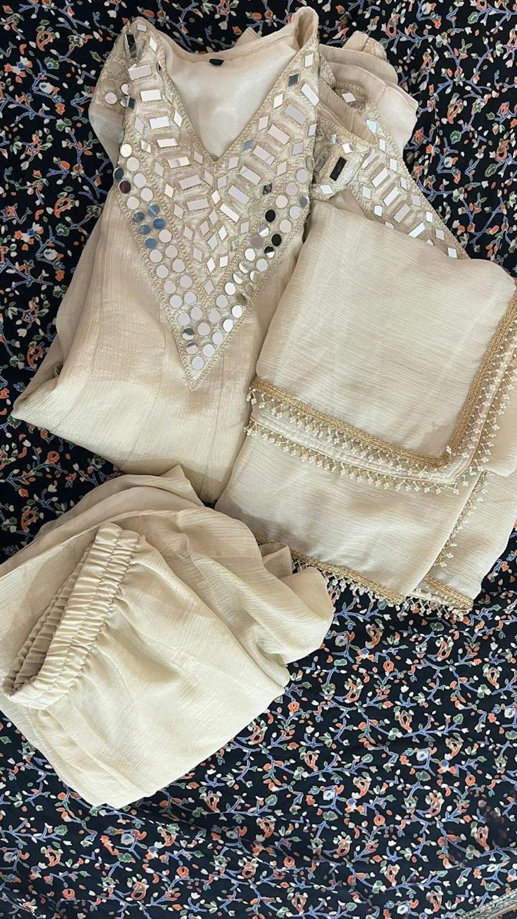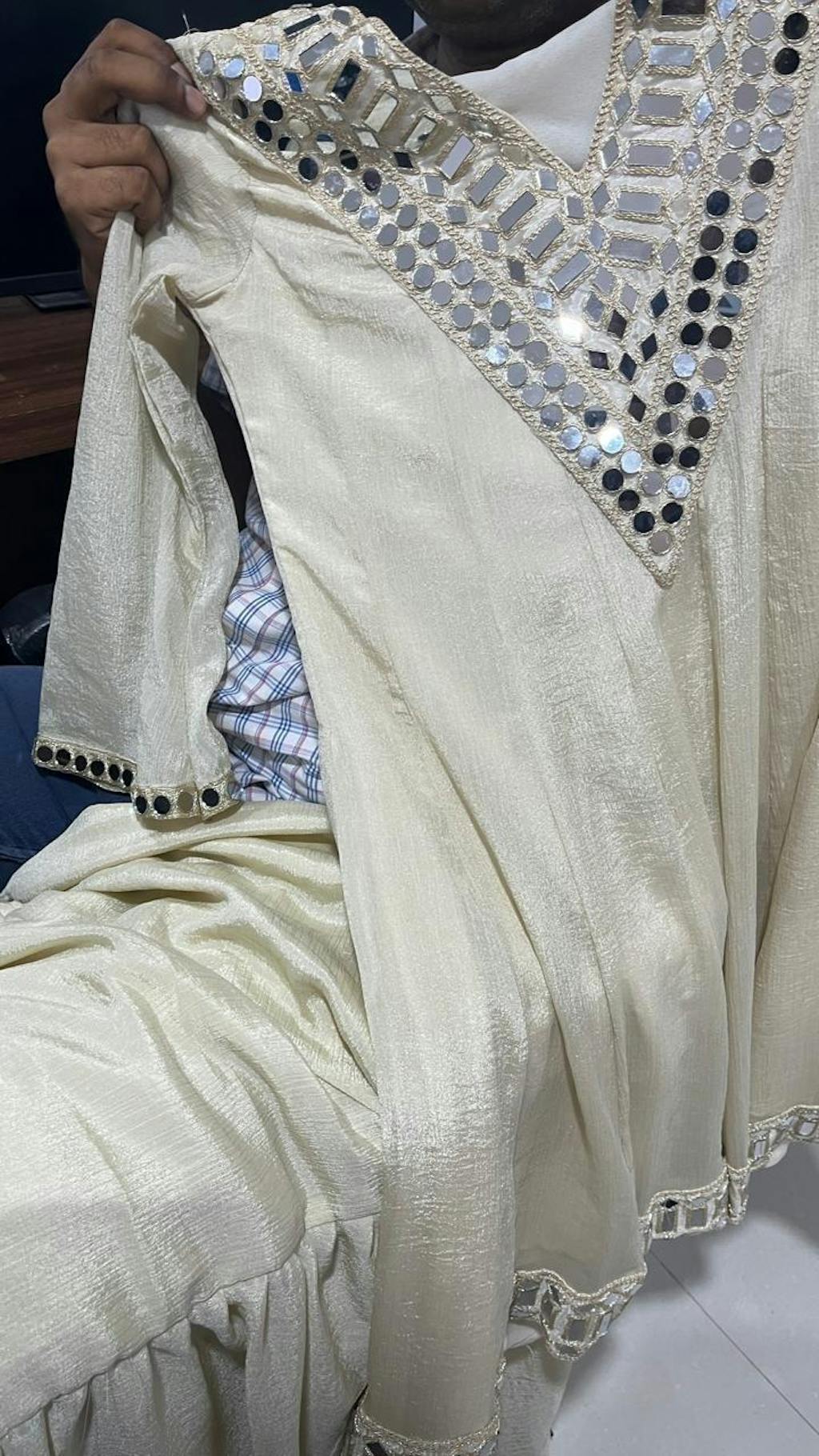 The highlight of this ensemble is the heavy hand mirror work (sheesha work) on the neckline, hemline, and sleeves—giving it a royal and sparkling festive look. The fabric flows gracefully, offering a comfortable and elegant drape.