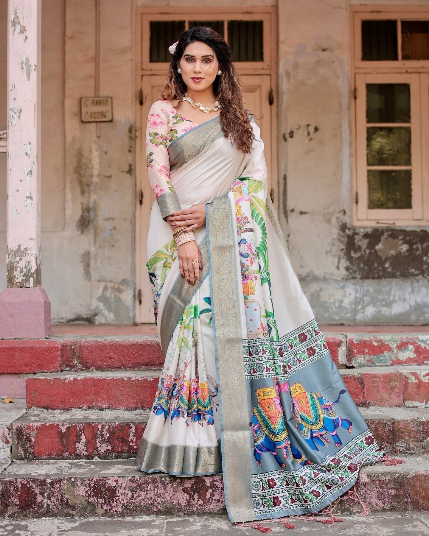 Step into regal elegance with this stunning ivory Tussar silk saree, featuring a captivating pallu adorned with vibrant, hand-drawn elephant and floral motifs. The artwork, enriched with hues of royal blue, green, and golden yellow, adds an opulent touch that celebrates Indian heritage.
