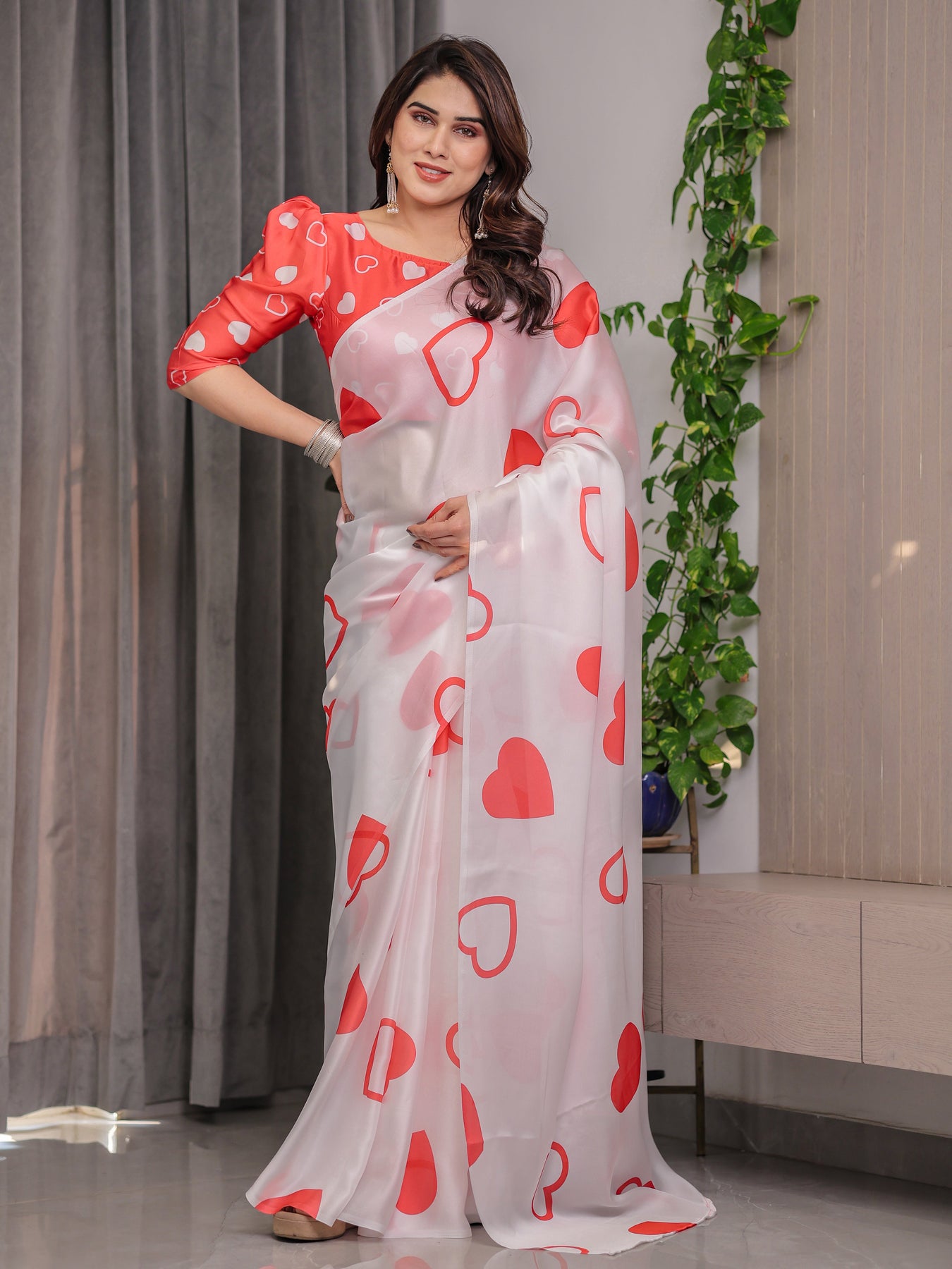 Ivory White Satin Georgette Saree with Bold Red Heart Print and Attached Red Heart Pattern Blouse – 5.5 Meter Romantic Designer Saree for Valentine’s Day & Anniversary Wear