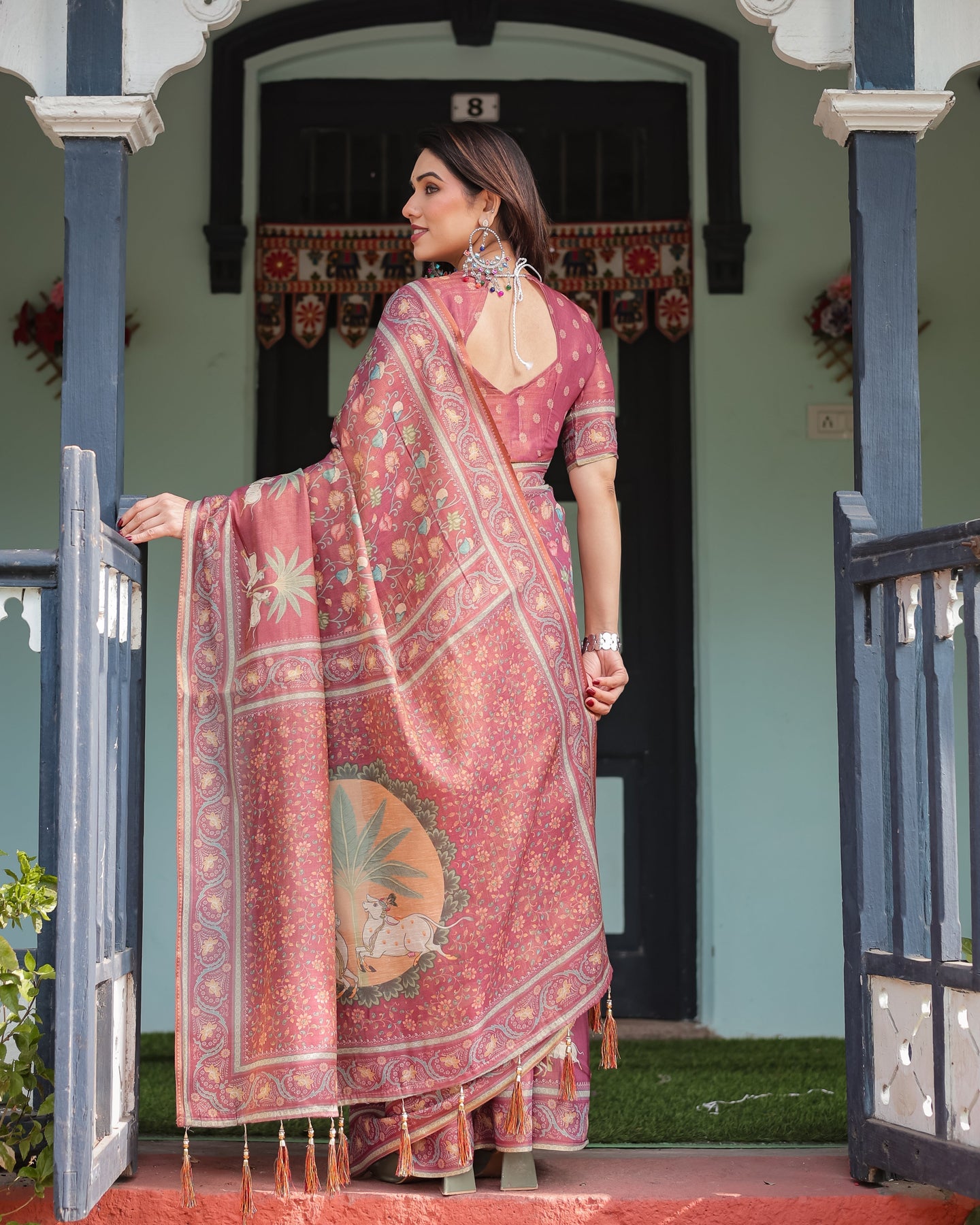 Mauve with Floral Motifs Linen Cotton Handloom Printed Saree, Pastoral Scene Pallu, and Tassels
