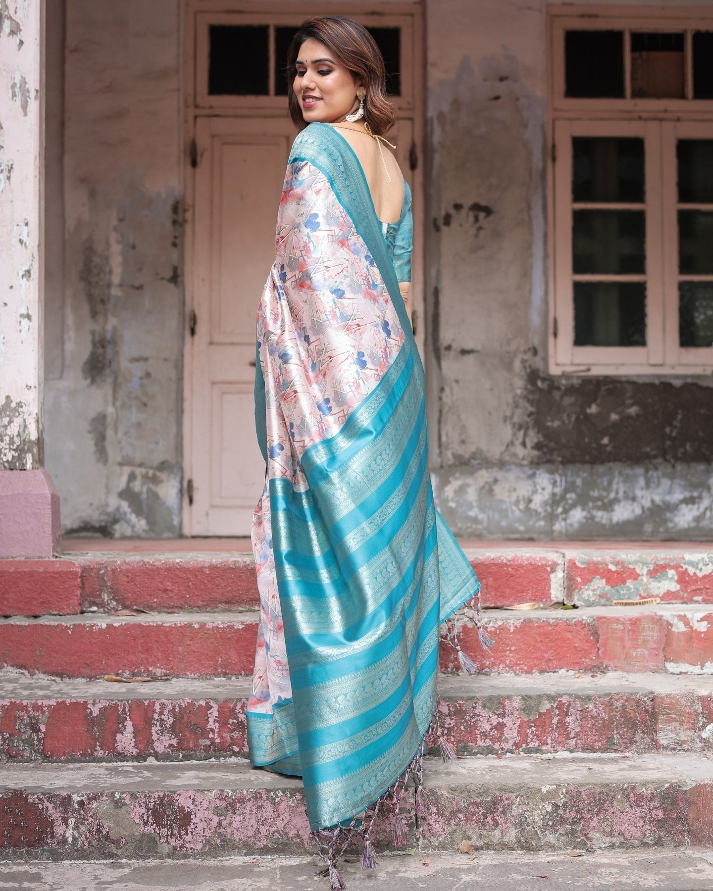 Mesmerizing Aqua Banarasi Silk Saree with Digital Print and Tassels