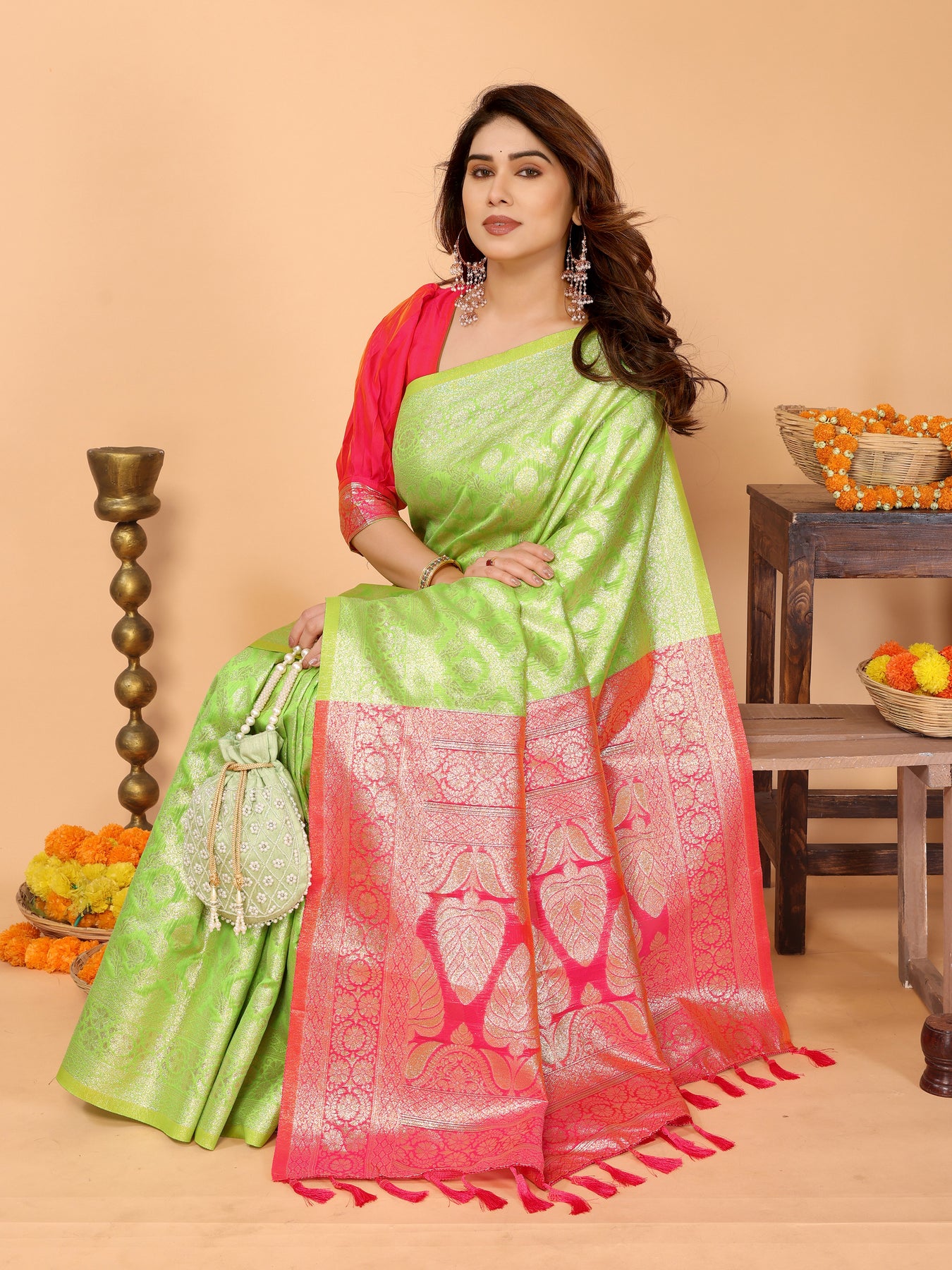 Parrot Green Banarasi Silk Saree with Coral Pink Pallu & Zari Weaving – Festive Traditional Wear