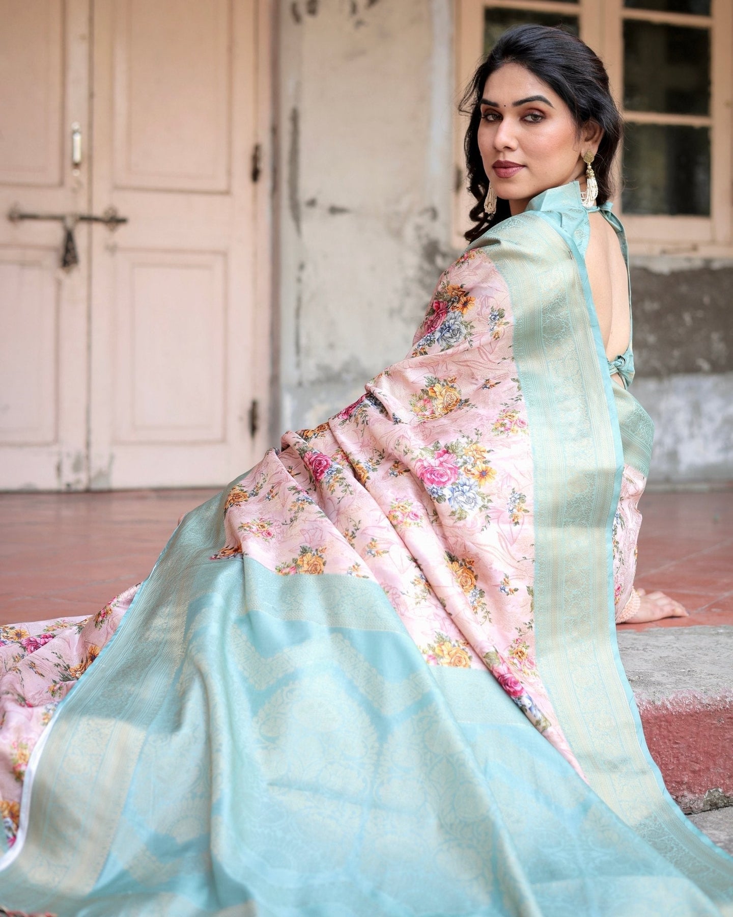 Pink and Green Floral Digital Print Banarasi Silk Saree with Zari Weave and Tassel Pallu