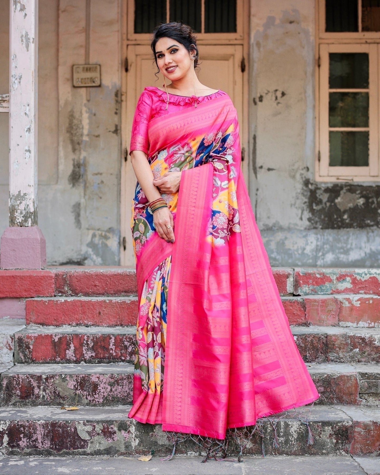 Hot Pink Multicolor Floral Digital Printed Banarasi Silk Saree with Zari Woven Border and Solid Pink Pallu - Includes Tassels