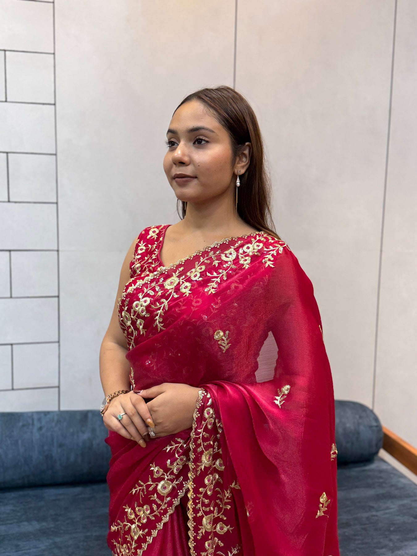 Rust Orange Space silk Saree with Golden Floral Embroidery & Designer Blouse - Festive & Party WearJamuni Purple Space silk Saree with Golden Floral Embroidery & Designer Blouse - Festive & Party WearWine color Space silk Saree with Golden Floral Embroidery & Designer Blouse - Festive & Party Wear