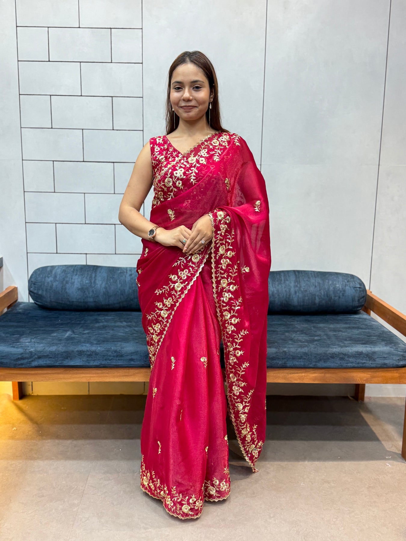 Rani Pink Space silk Saree with Golden Floral Embroidery & Designer Blouse - Festive & Party Wear