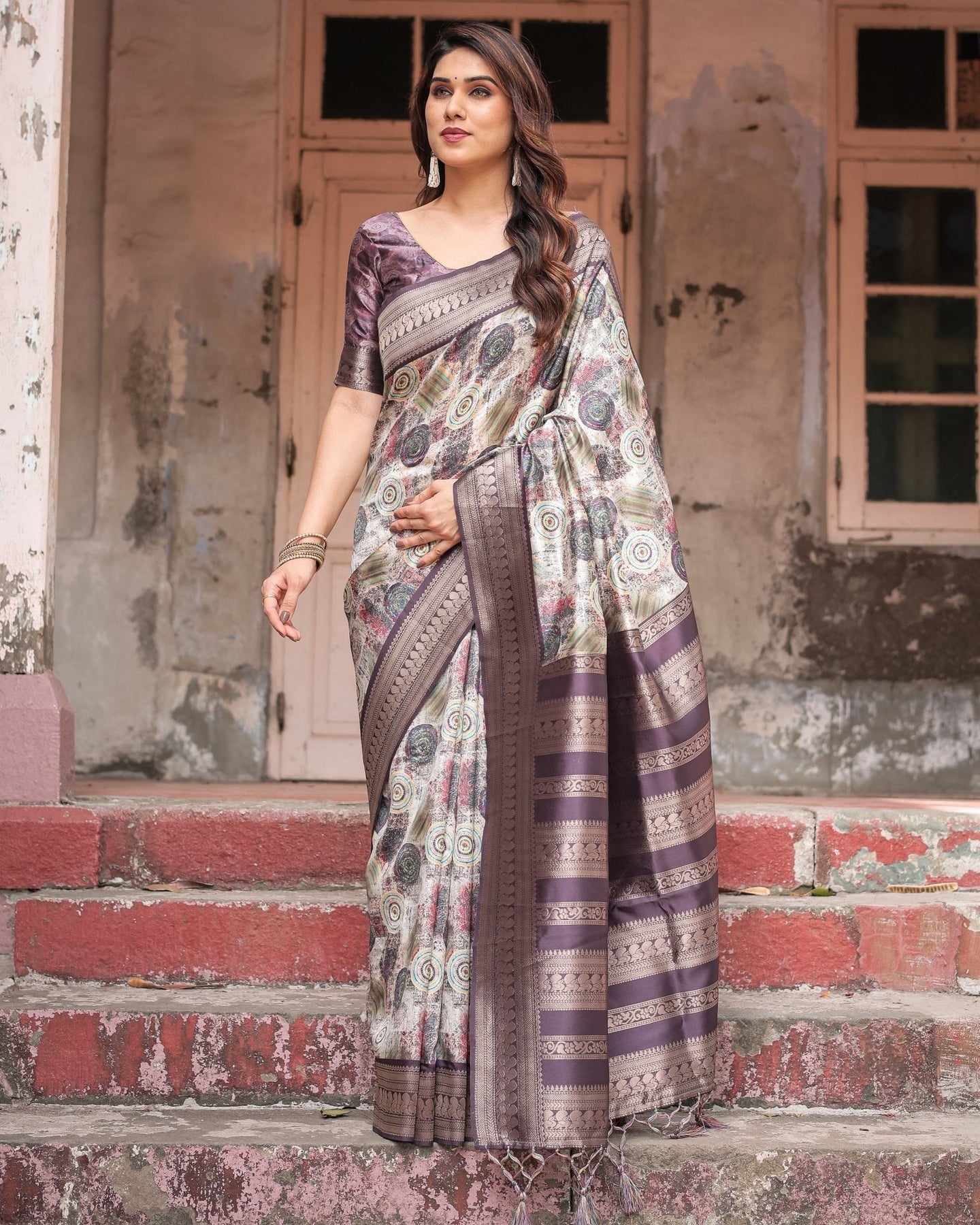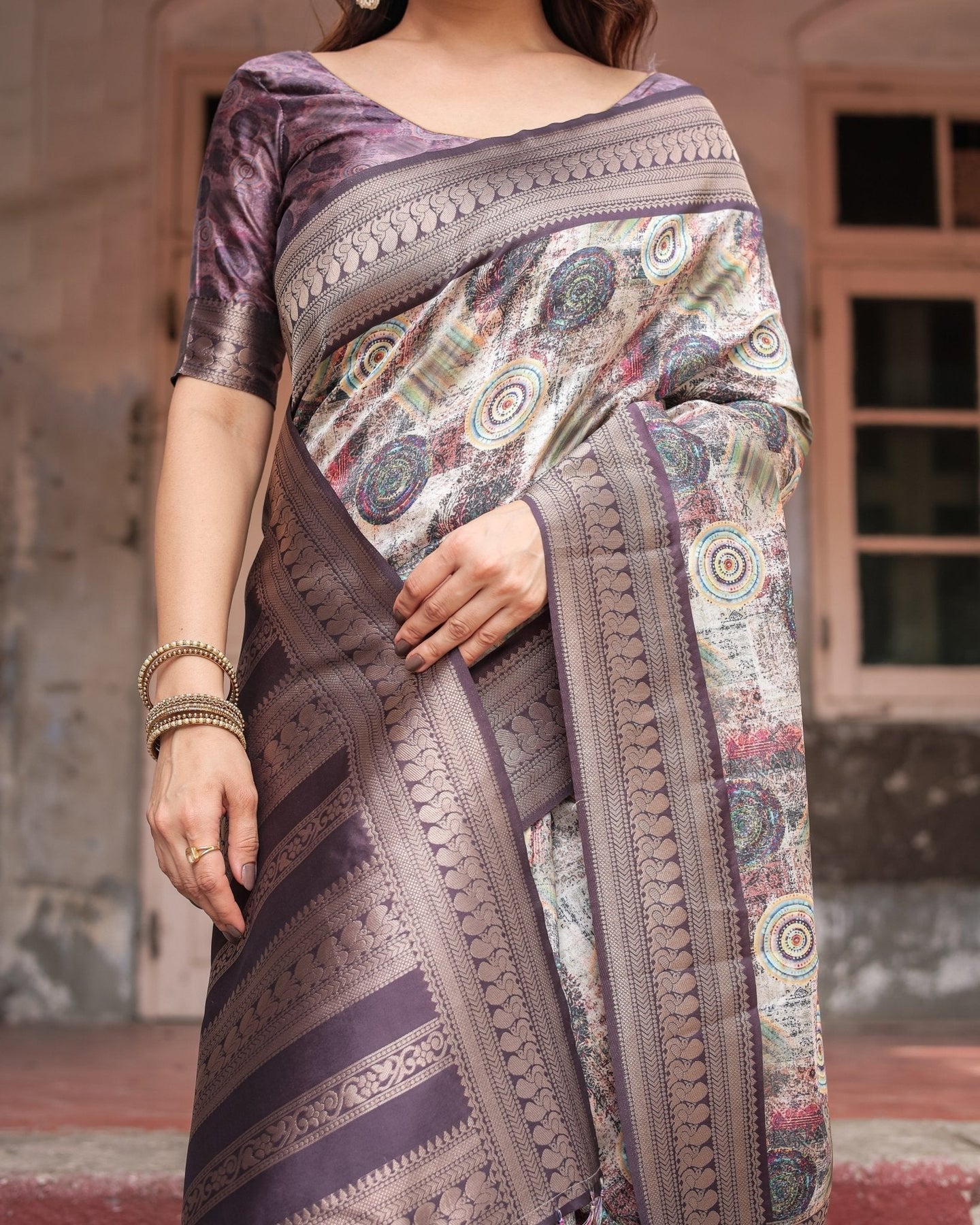 Regal Purple Banarasi Silk Saree with Digital Print and Ornate Border