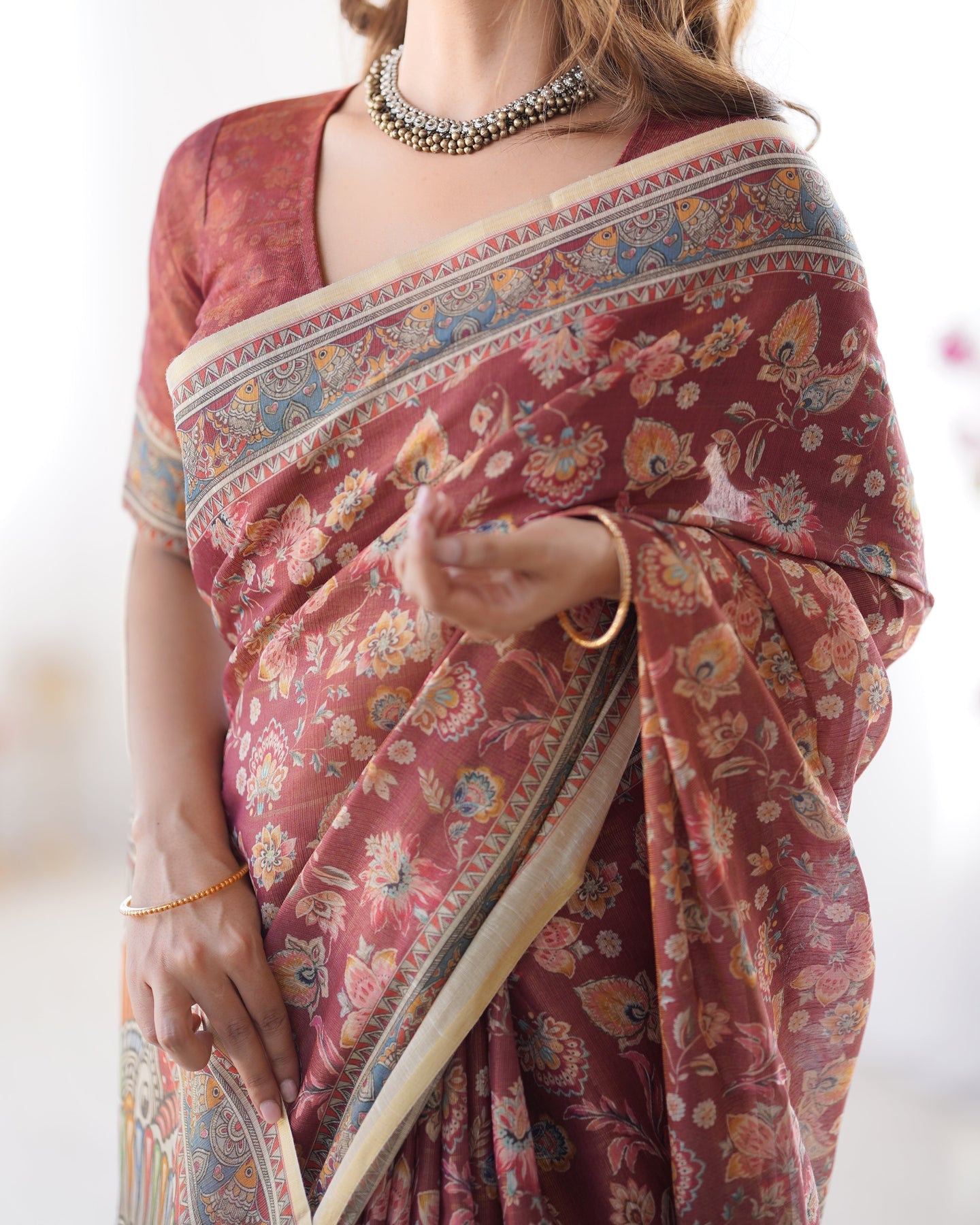 Rust Maroon Handloom Cotton Saree with Floral Jaal & Multicolor Mandala Pallu Art