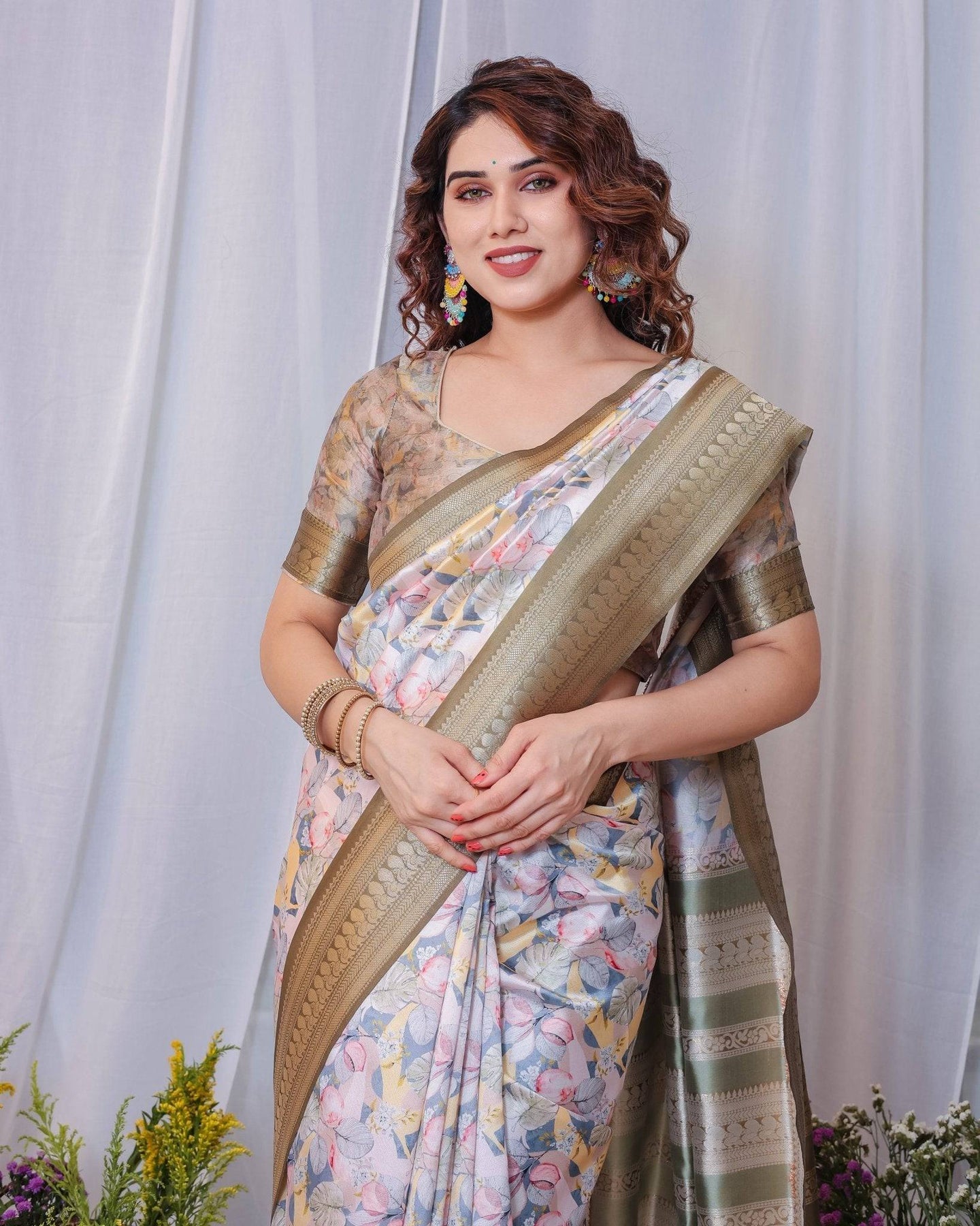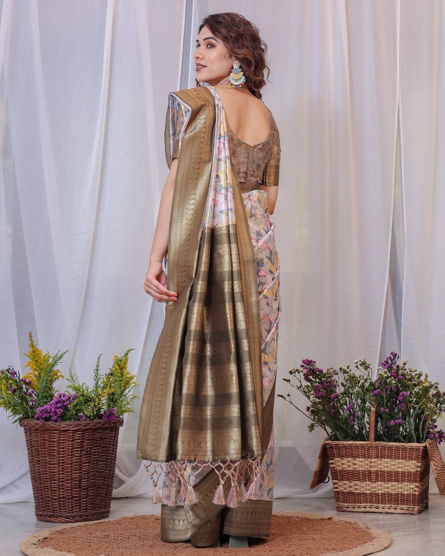 Sophisticated White and Olive Floral Digital Print Silk Saree with Zari Tassels