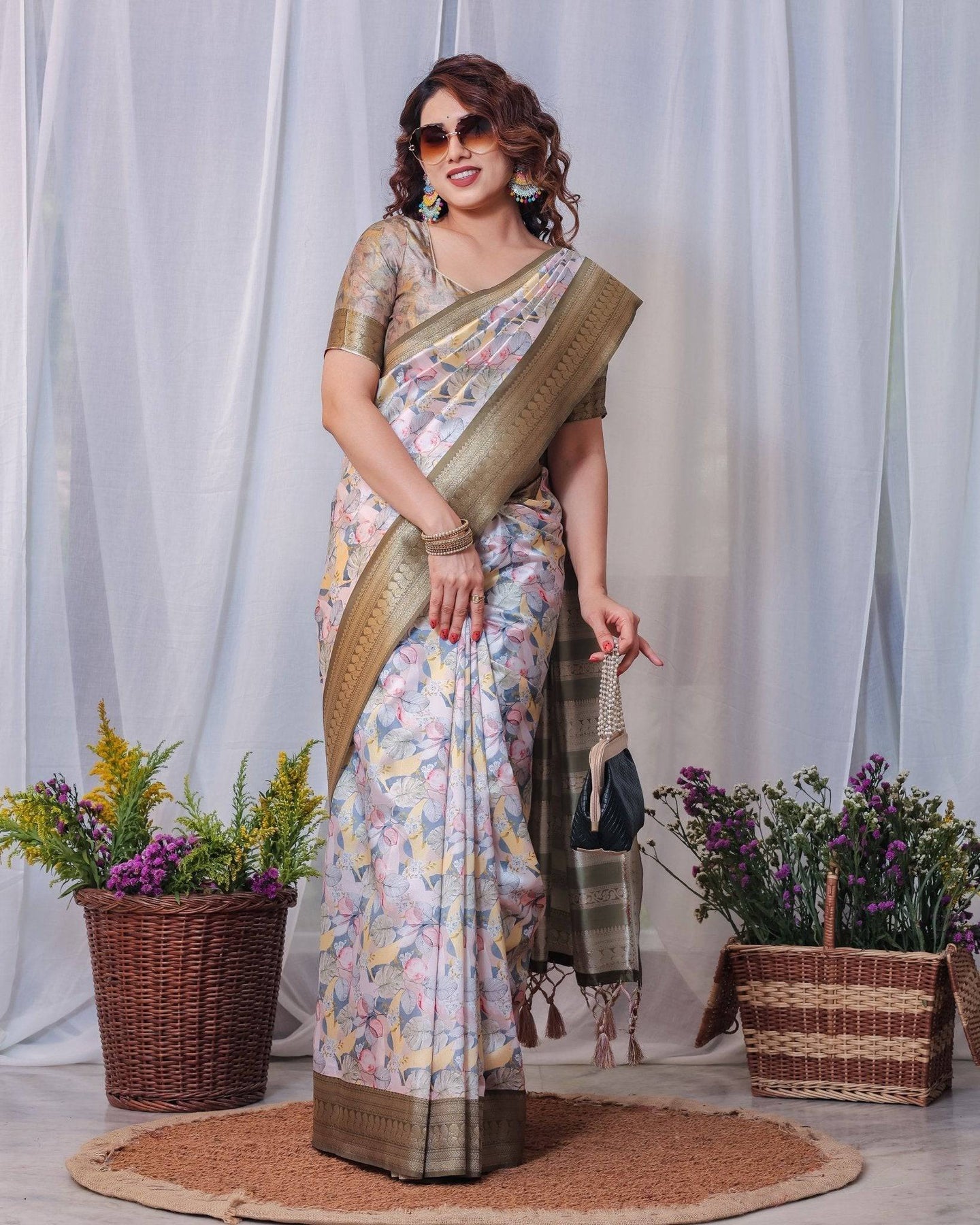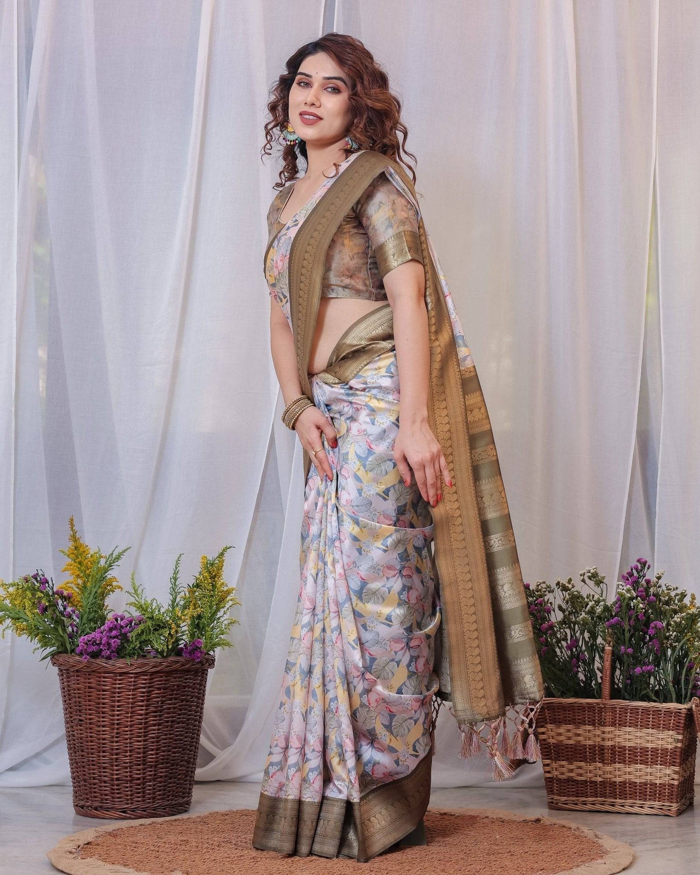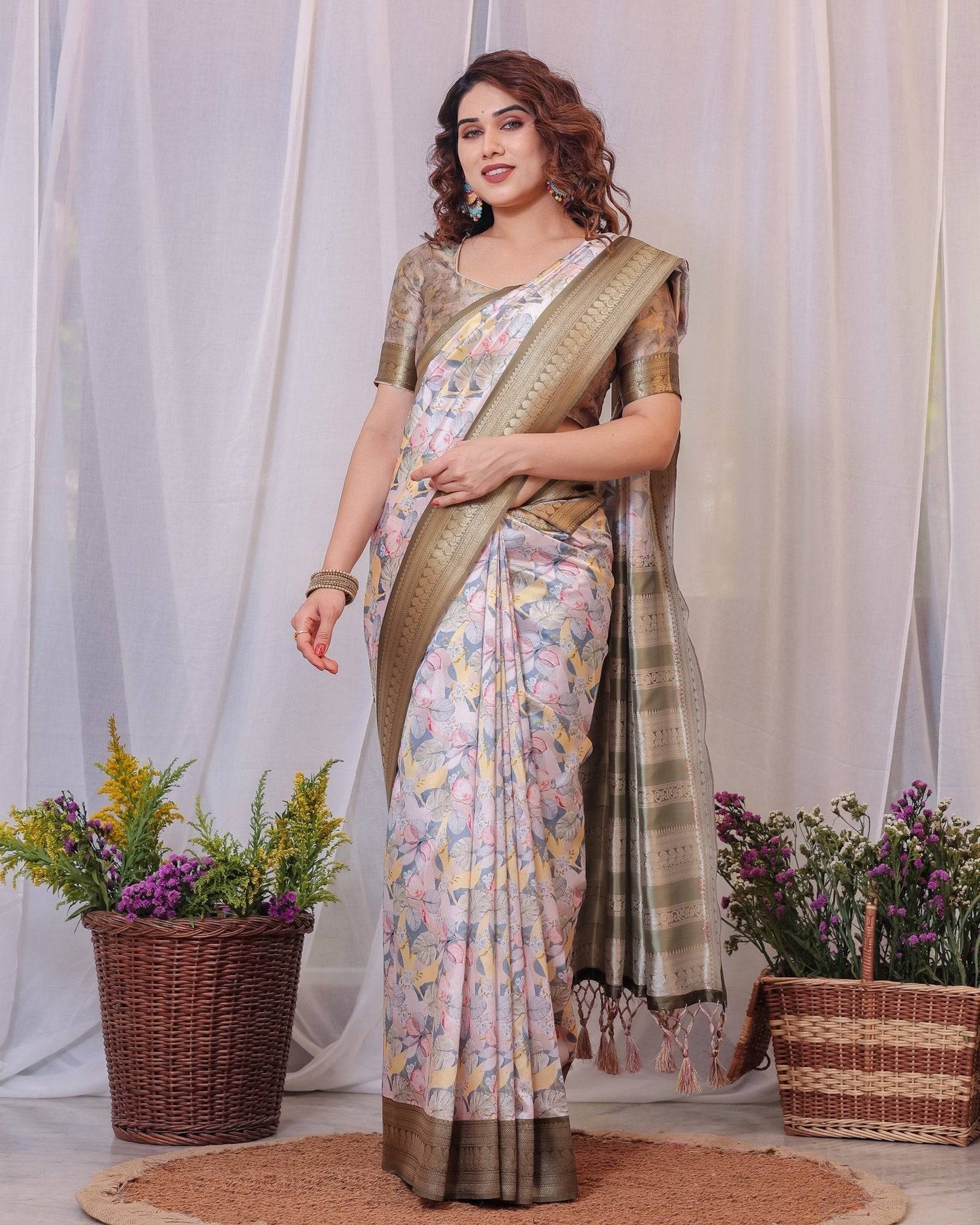 Step into elegance with this stunning white silk saree adorned with olive and multicolor floral digital prints. The rich olive zari border and pallu add a touch of traditional grace, beautifully complemented by intricate tassels. Designed in pure silk, this saree offers a perfect blend of comfort and grandeur, making it ideal for weddings, festivities, and special occasions. Pair it with the matching blouse for a look that's both classic and contemporary.