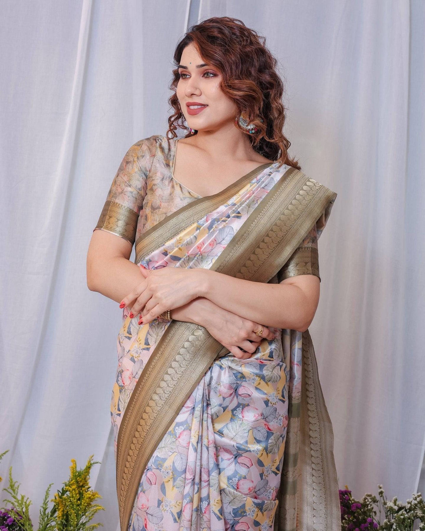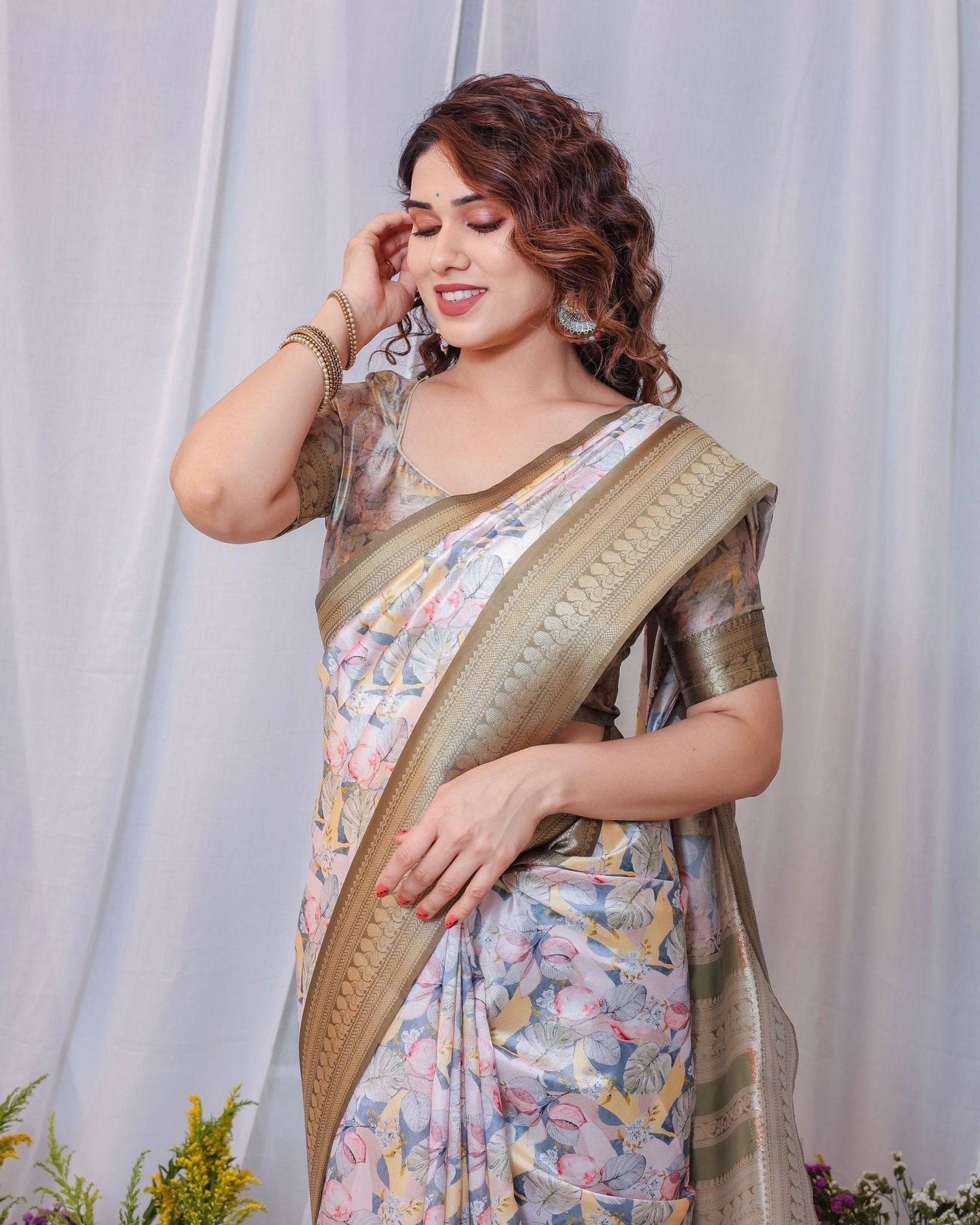 Elevate your ethnic collection with this pure Banarasi digitally printed silk saree, a masterpiece that seamlessly blends traditional artistry with modern sophistication.