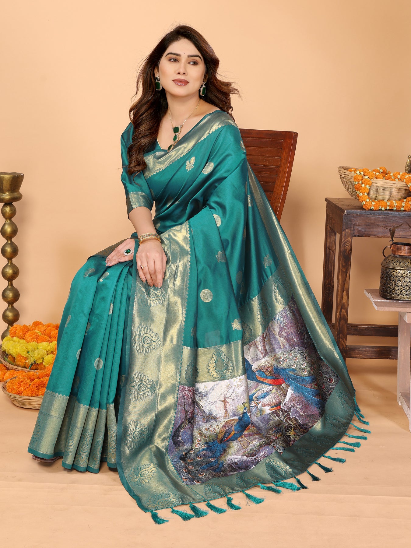 Teal Green Banarasi Silk Saree with Golden Zari Weaving & Peacock Digital Print Pallu – Festive & Wedding Wear
