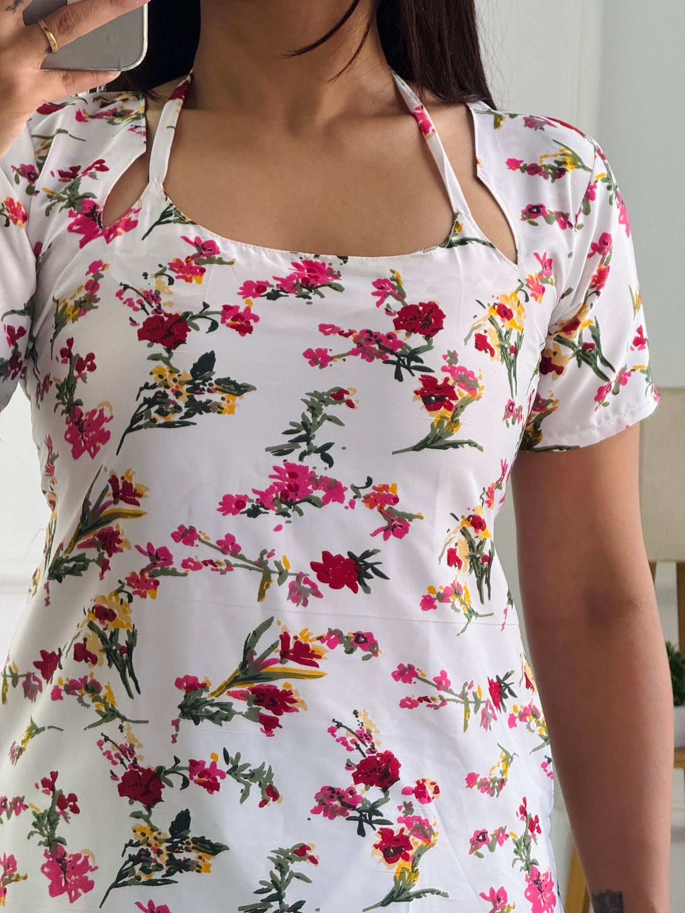 White Base Floral Print Cambric Cotton Kurti with Corset Back