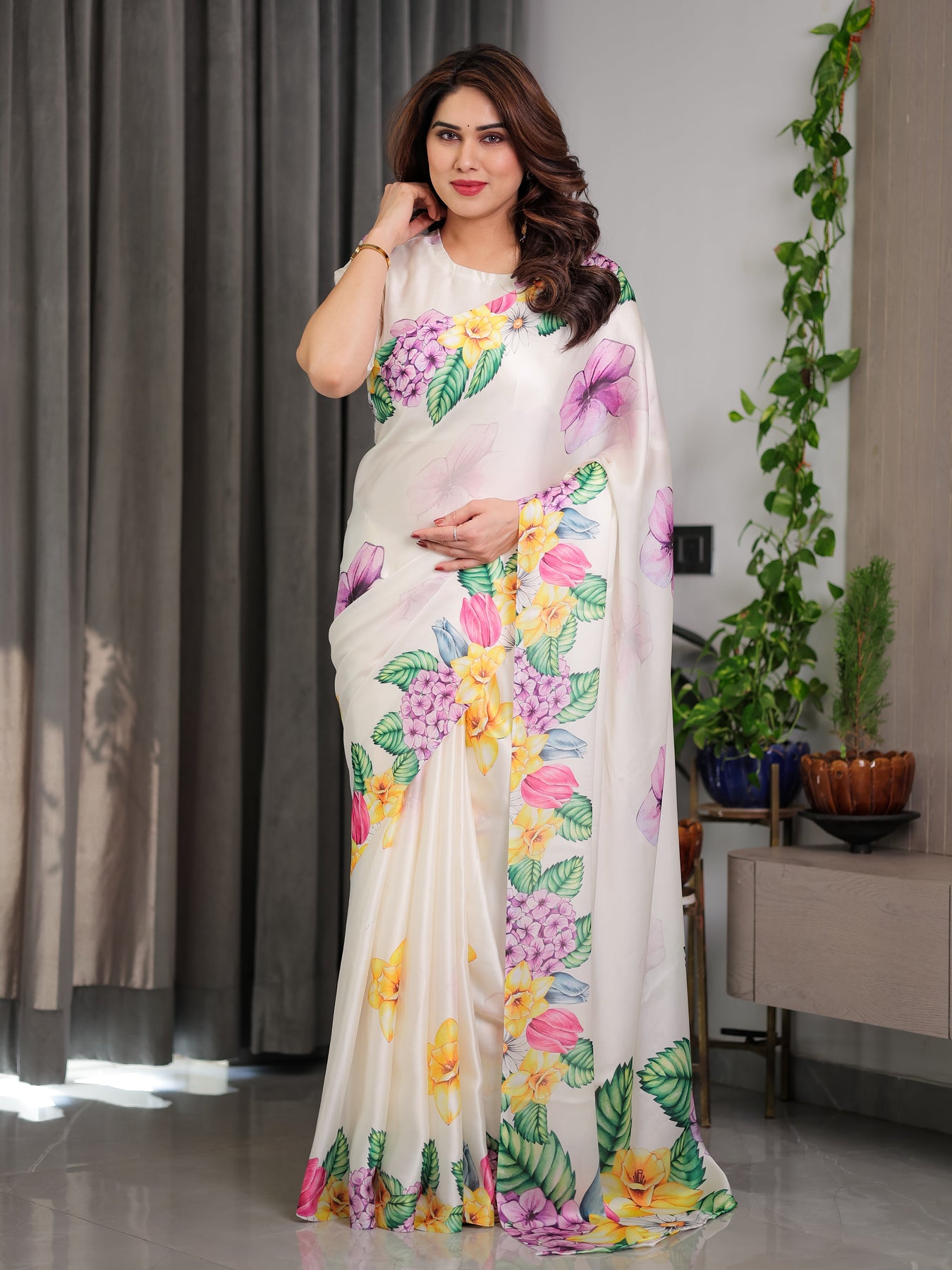 Ivory White Floral Garden Print Satin Georgette Saree with Multicolor Tropical Flowers & Designer Attached Blouse