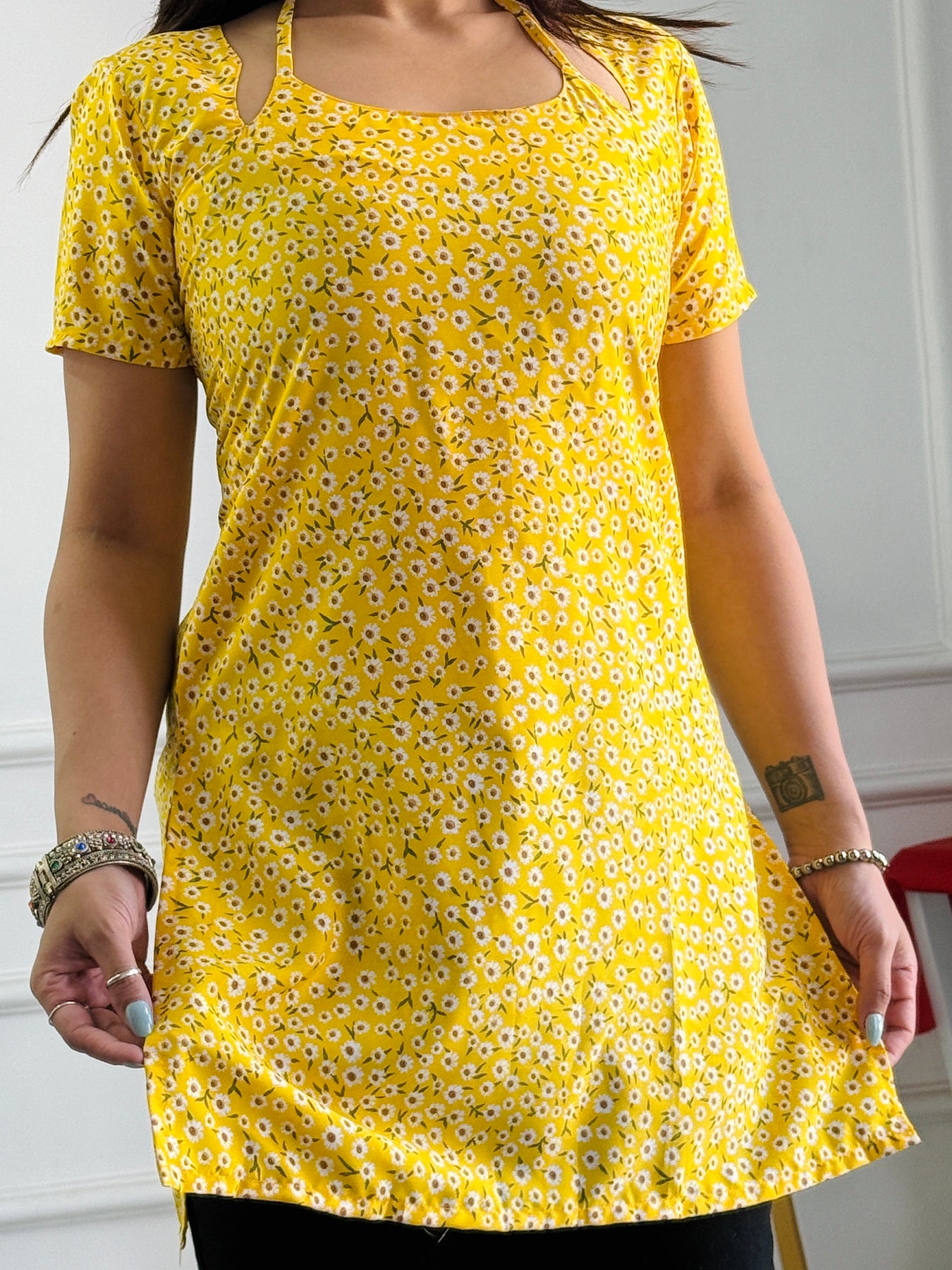 Yellow Ditsy Floral Kurti with Adjustable Lace-Up Back